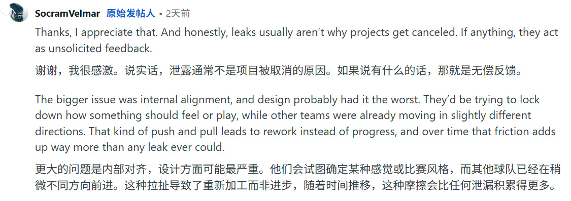 关于项目取消前的整体状态,SocramVelmar指出存在"内部协调问题",即工作室难以统一游戏操作手感。不同团队间存在"方向性偏差",导致大量返工而非优化推进。该人士同时澄清泄露的截图或预告片并非项目取消主因,这些泄露内容更多被工作室视为"非主动收集的反馈"。