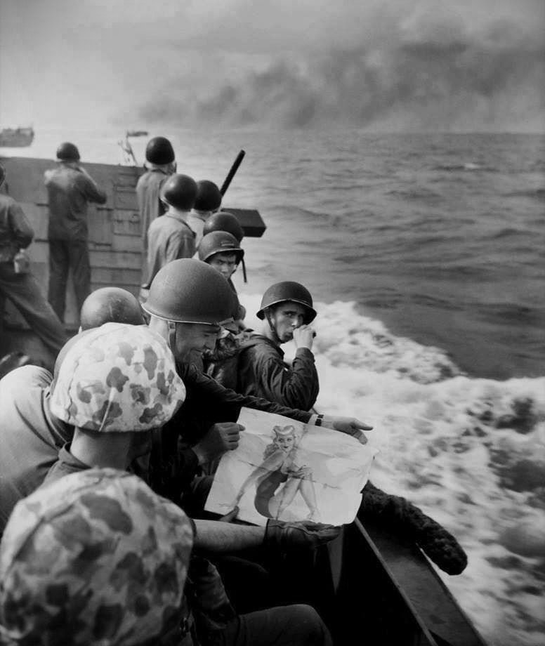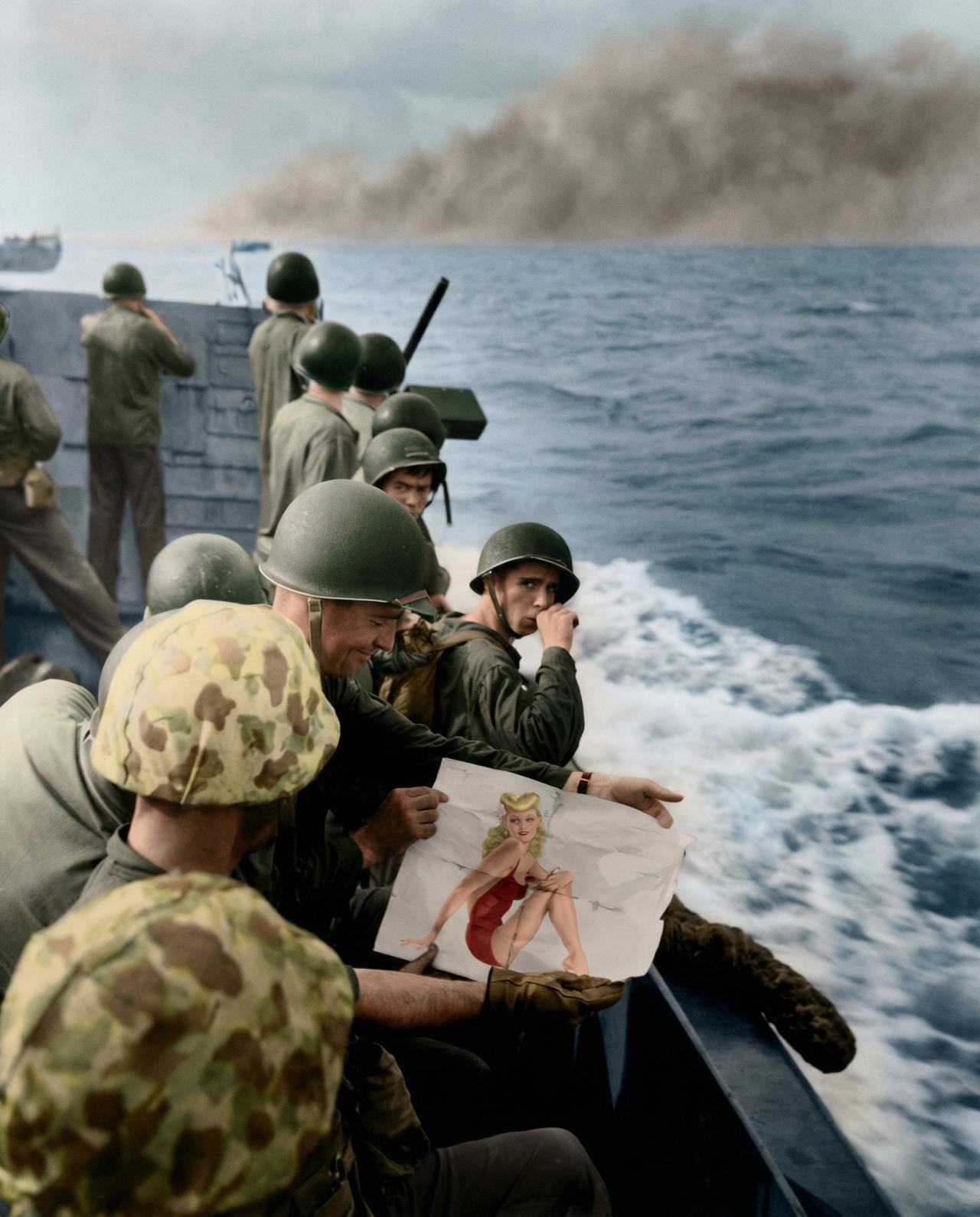 航渡途中,士兵们在颠簸的海面上检查武器、交换沉默的目光,照片上的士兵略显轻松地向同伴们展示他所携带的美式女郎画报,试图在即将到来的风暴前抓住最后一丝人性的温度。