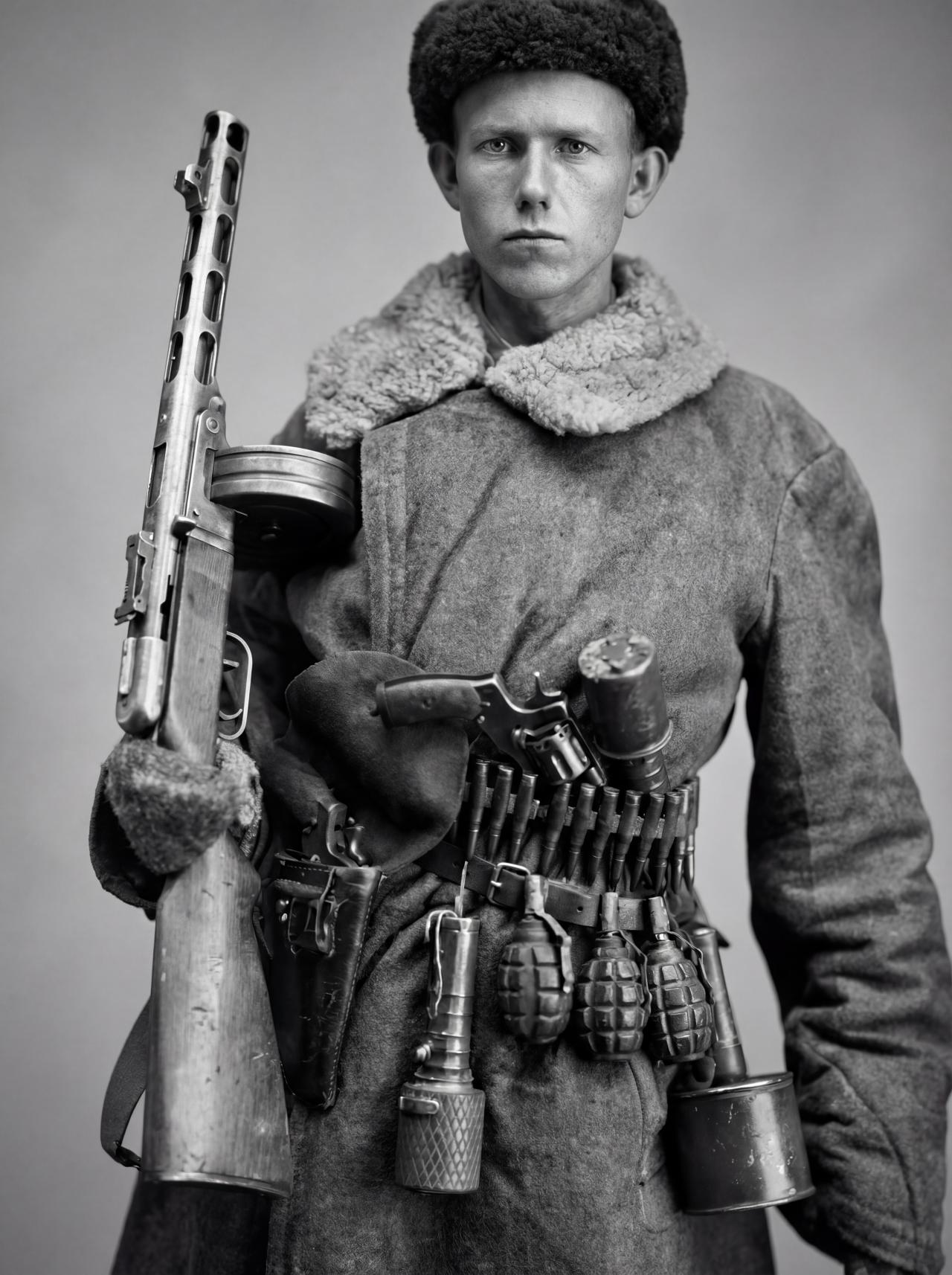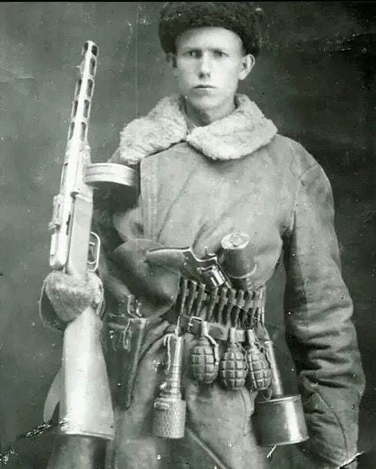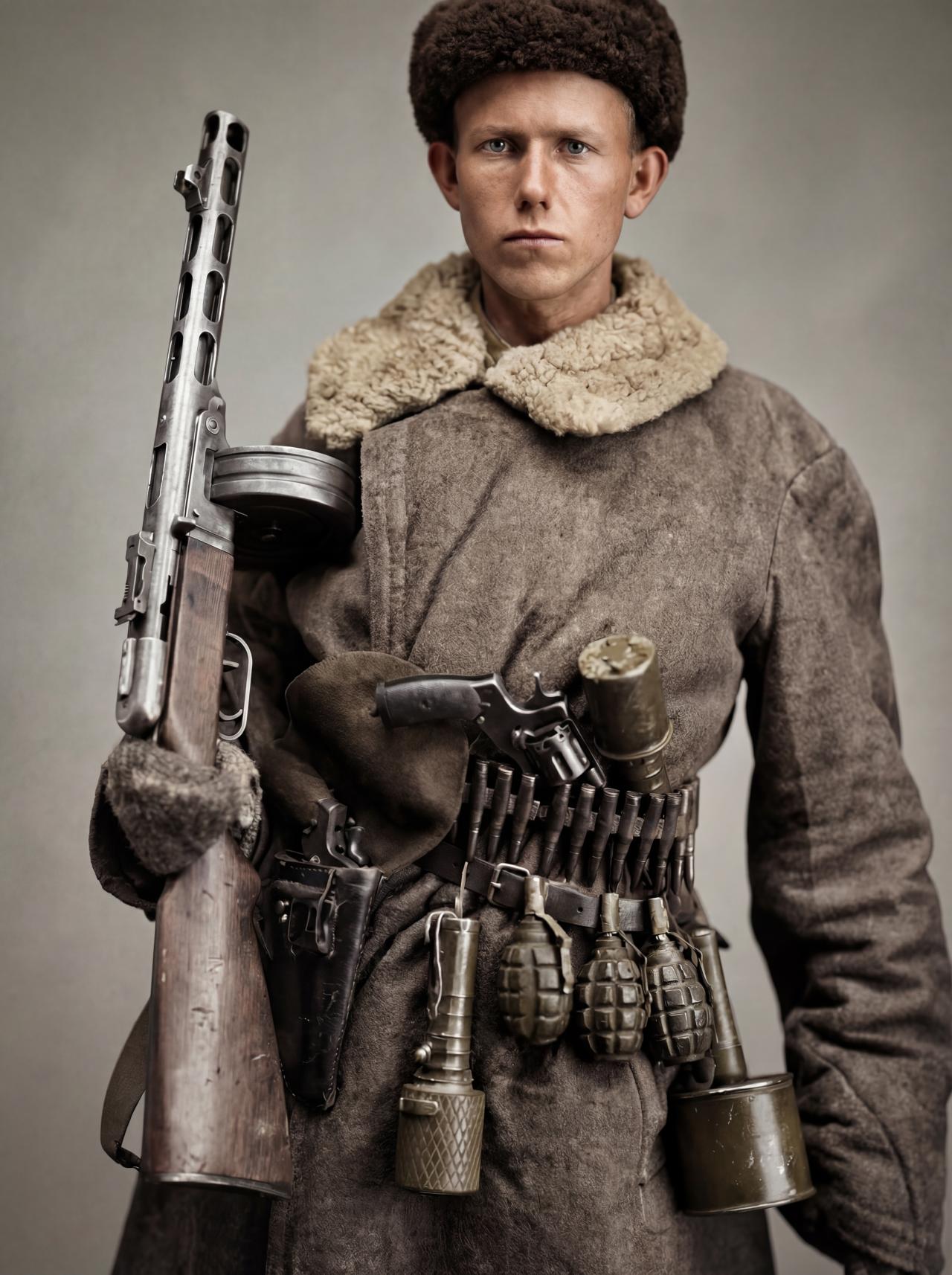 他身穿厚实的冬季棉袄(vatnik或类似 padded jacket),领口围着毛皮围巾或羊皮领,头戴毛皮乌尚卡帽(ushanka),表情严肃而坚定。武器配置极为丰富:主武器为PPSh-41冲锋枪(配71发鼓形弹匣),腰上挂弹链(bandolier)装满7.62×54R步枪弹(可能为支援机枪手或缴获弹药),腰间皮带上挂有多个手榴弹(包括F-1柠檬形手榴弹、RGD-33、RPG-40反坦克手榴弹及德国Stielhandgranate 24柄式手榴弹),另携两把M1895纳甘左轮手枪、信号弹筒等,体现出游击队员典型的“缴获与混装”风格——大量使用缴获德军装备补充自身不足。
