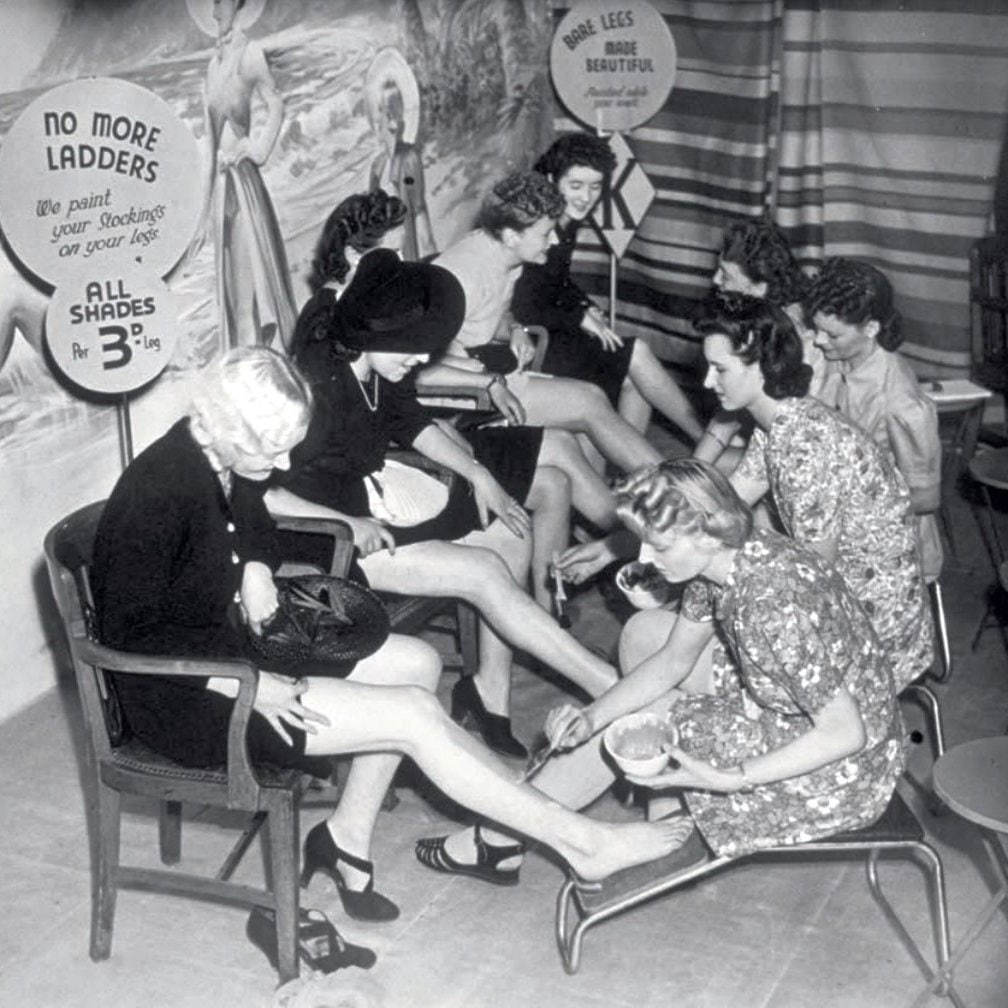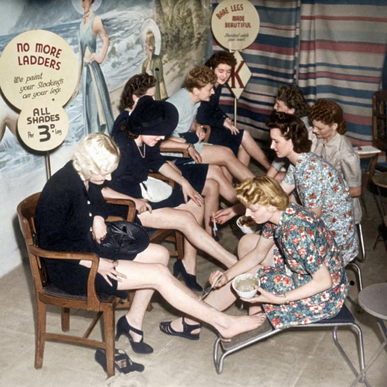 丝袜曾是当时女性时尚的重要象征,尤其在欧美城市,被视为体面与优雅的标配。为维持外观,不少女性想出了“画丝袜”的办法:在腿部涂抹与肤色接近的化妆品,再用细笔或眼线笔在小腿后方画出一条“接缝线”,模拟真丝袜的效果。甚至还有专门提供“丝袜绘制服务”的美容店。