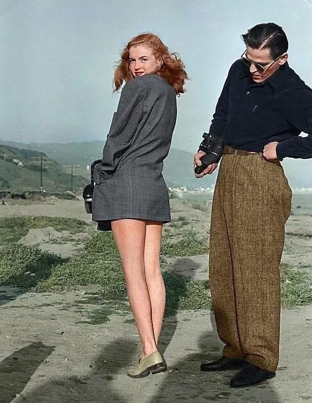 照片中,年轻的诺玛·珍·贝克背对镜头,穿着灰色格纹短款西装外套(下摆堪比迷你裙),内搭黑色短裙,露出修长双腿,脚穿浅绿色平底鞋。她微微侧头回头,露出俏皮的表情。男子站在她身后,身穿黑色衬衫与宽松的棕色高腰长裤,手持一台双镜头反光相机(推测为Rolleiflex相机),戴着墨镜,头发向后梳得整齐,姿态专注。