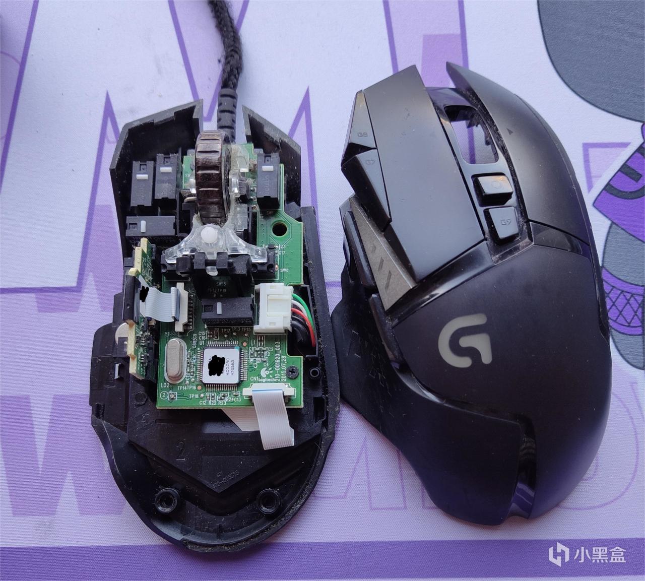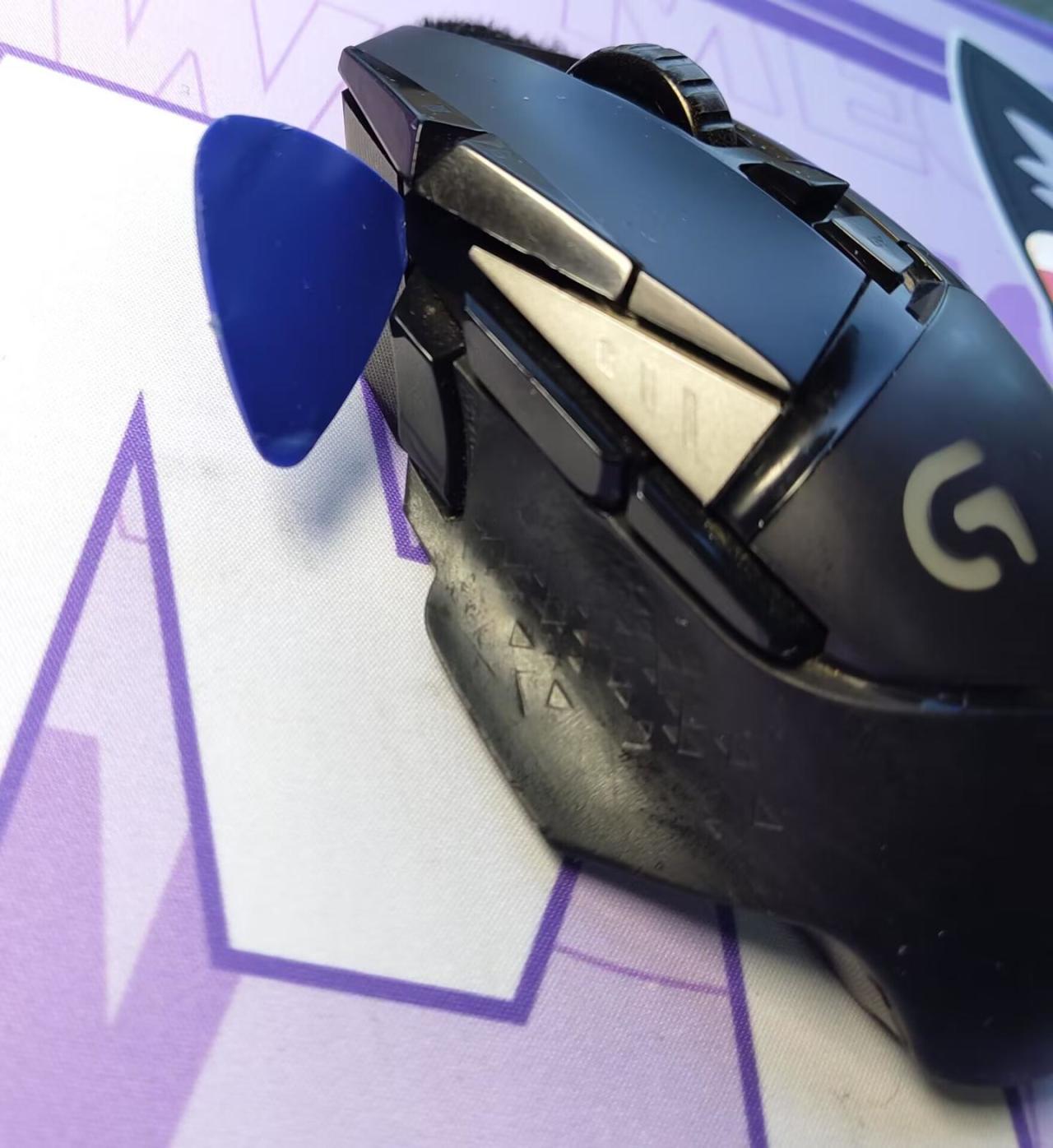 最后轻轻掰开上部即可。G502有线版的卡扣要比有线版紧的多,需要来回多次反复翘,并且有概率会把卡扣弄断。不过不用担心,即使没有部分卡扣,光靠螺丝也能固定的很牢固