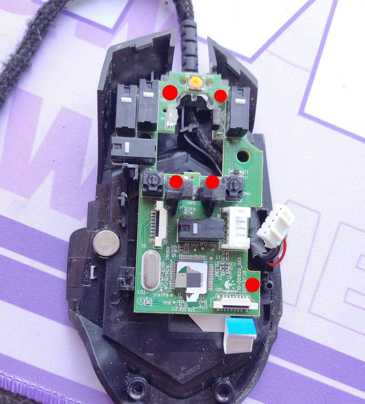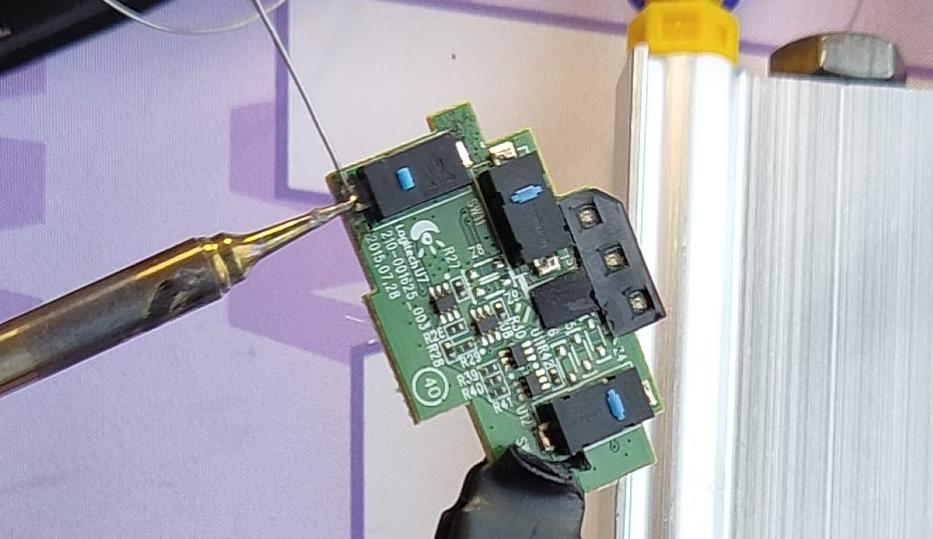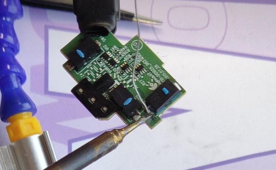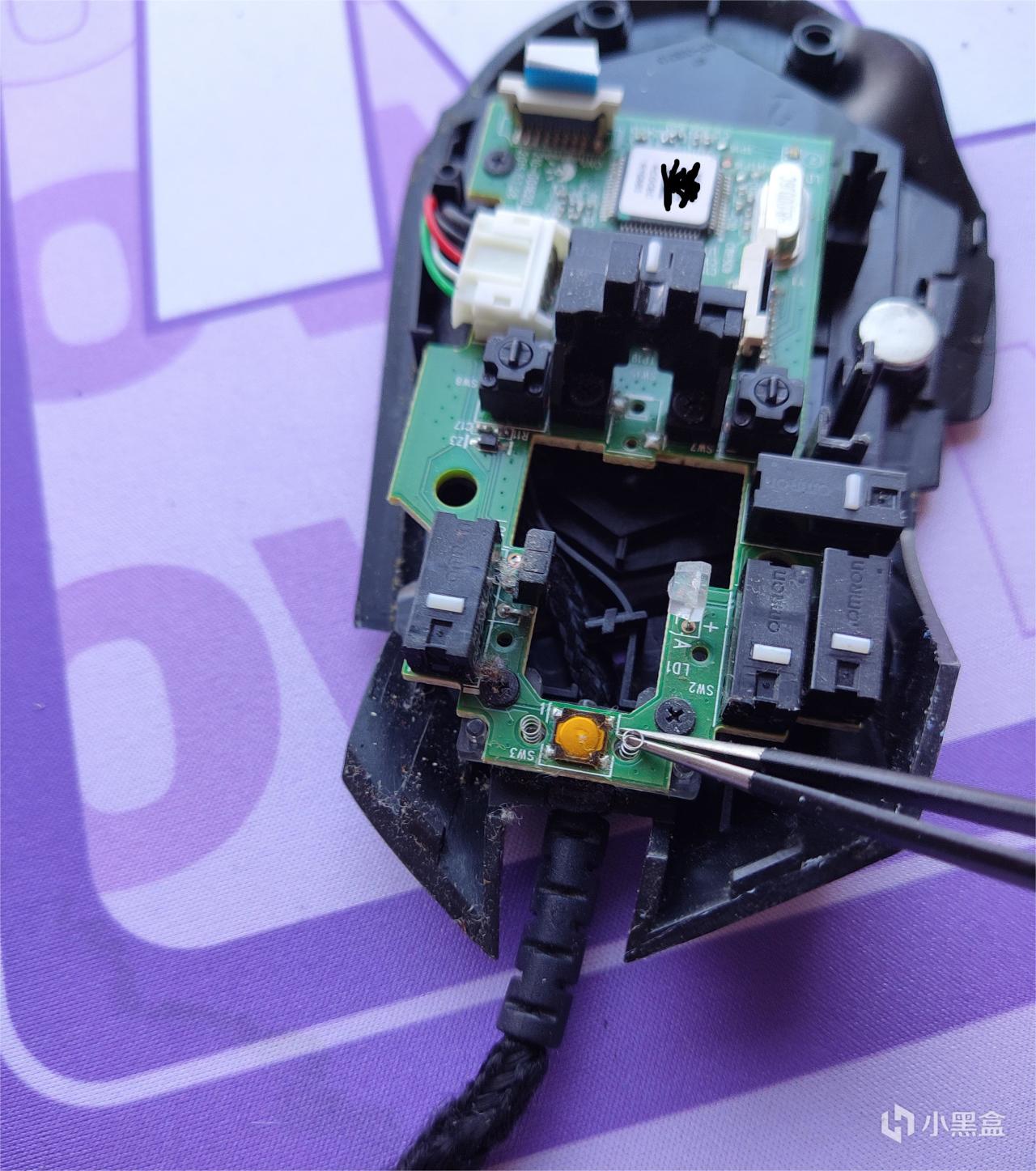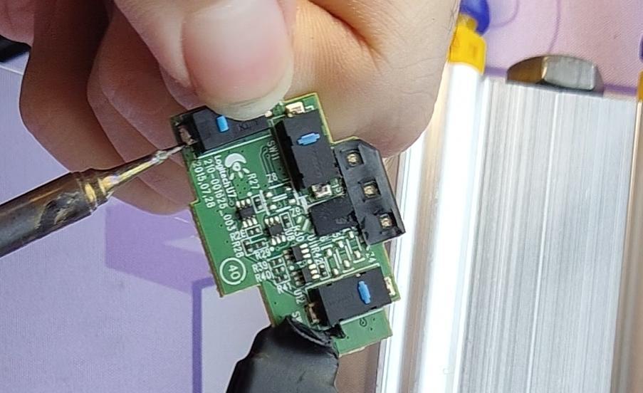 风险提示:焊接微动虽然不是特别难,但由于G502的焊盘受热容易脱落,脱落了整块板子就废了。因此建议新手先找个破鼠标练练手,切记请勿大力出奇迹!
