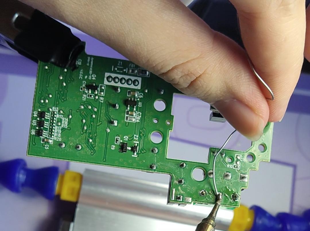 来回加热三个加过锡的针脚,并且用镊子稍稍用力往外拔。(只要针脚的锡都是融化状态,拔出来非常轻松,大力拔出可能会使板子报废)