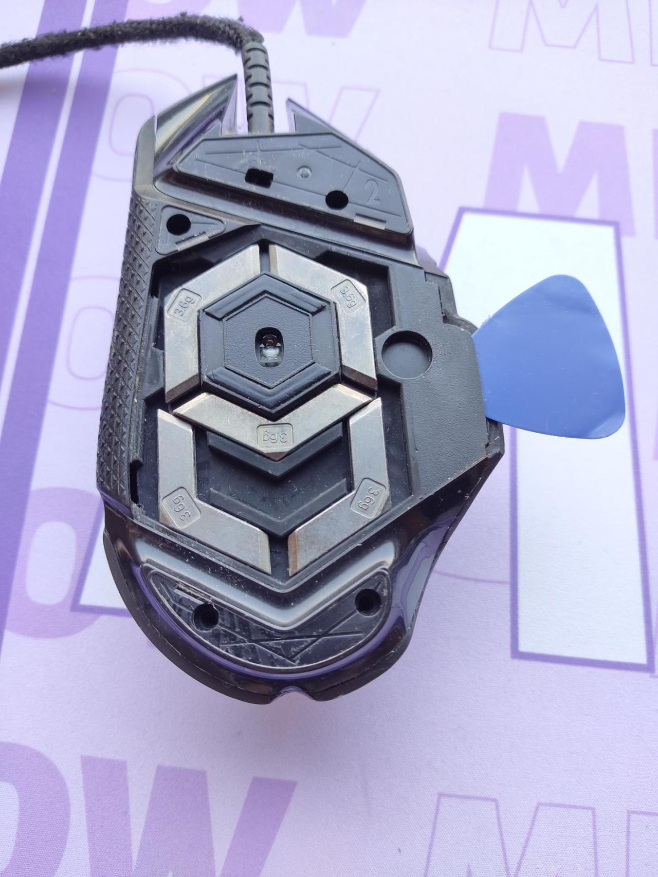 首先把鼠标翻过来,撕下所有的脚垫。沿着框的豁口直接用手撕即可。