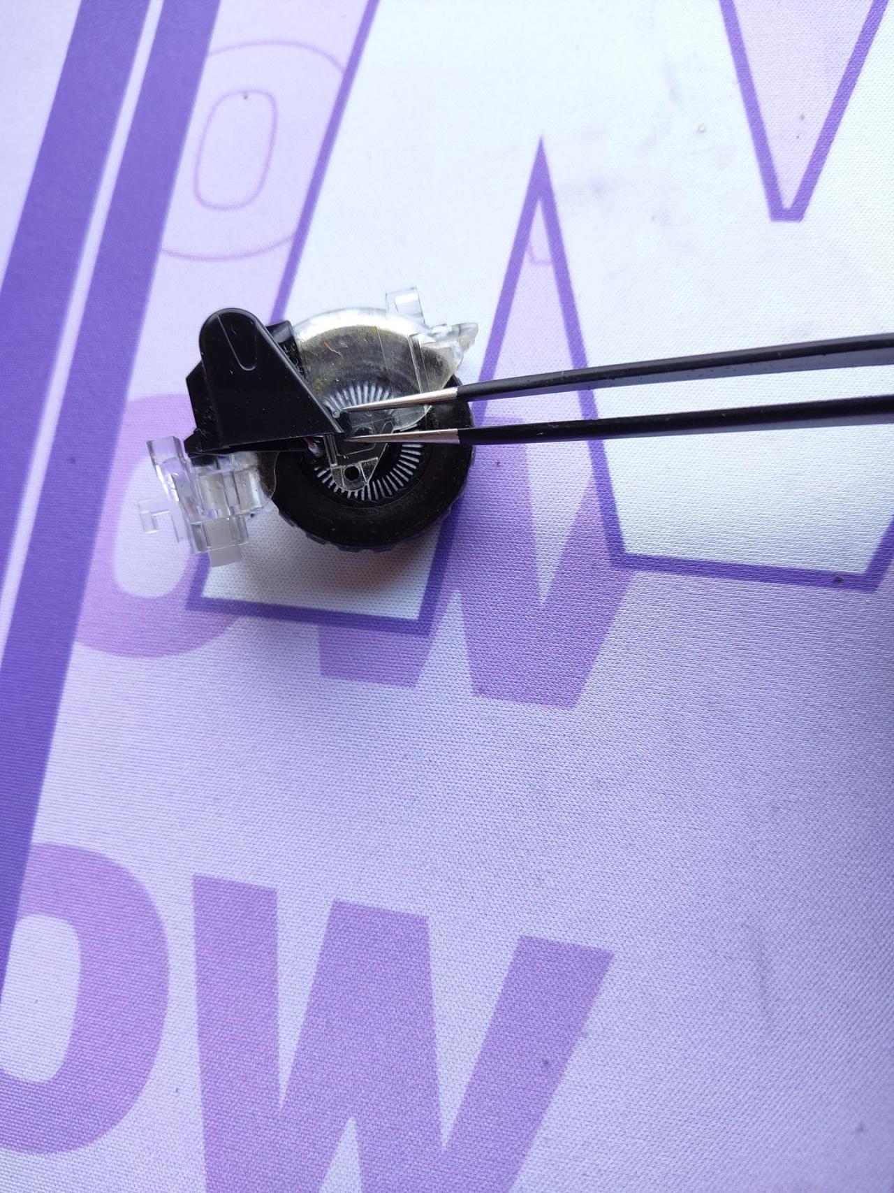 无极滚轮分两面,一面是凹下去的,一面是平的。拆滚轮时先掰凹下去那面,使滚轮固定杆脱出,再用镊子推一下平的那边,即可拆下,就像下图这样。切记请勿用力过猛,要是掰碎了就只能买新的了