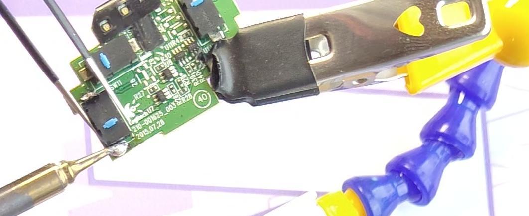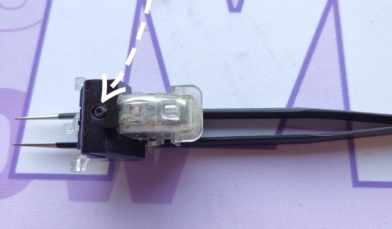 然后用镊子夹住微动,反复加热两个针脚,即可取下(如果镊子夹不牢,在微动侧边钻个洞把镊子插进去,边加热边轻轻用力挑即可取下)