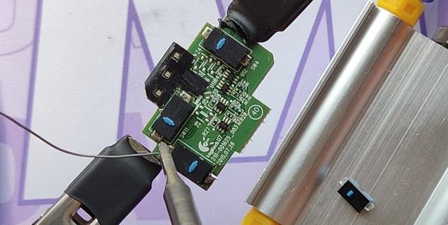 然后再把再来焊接微动,先给一个针脚上锡。再用手指顶住微动,加焊一下,确保微动紧贴pcb版。