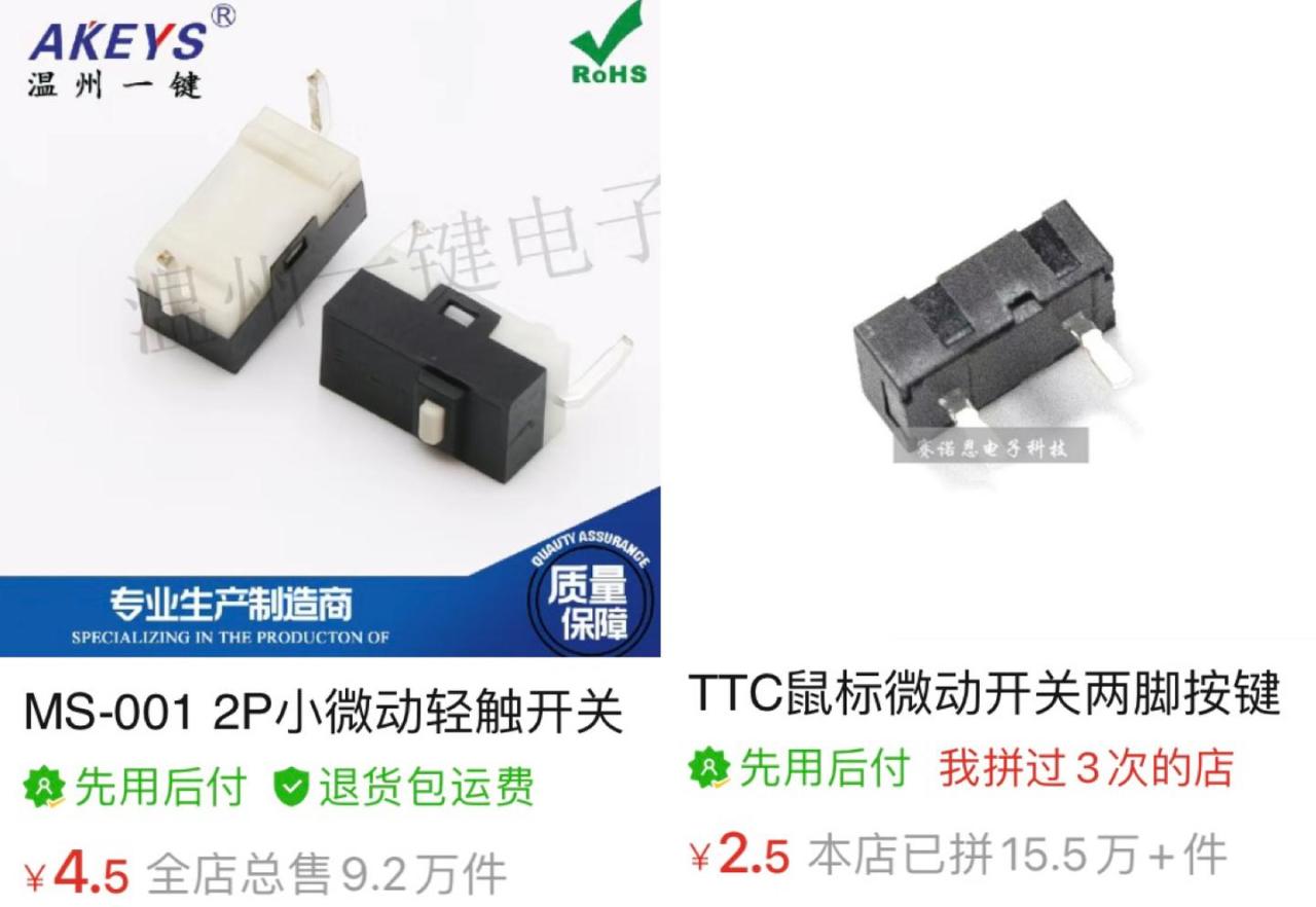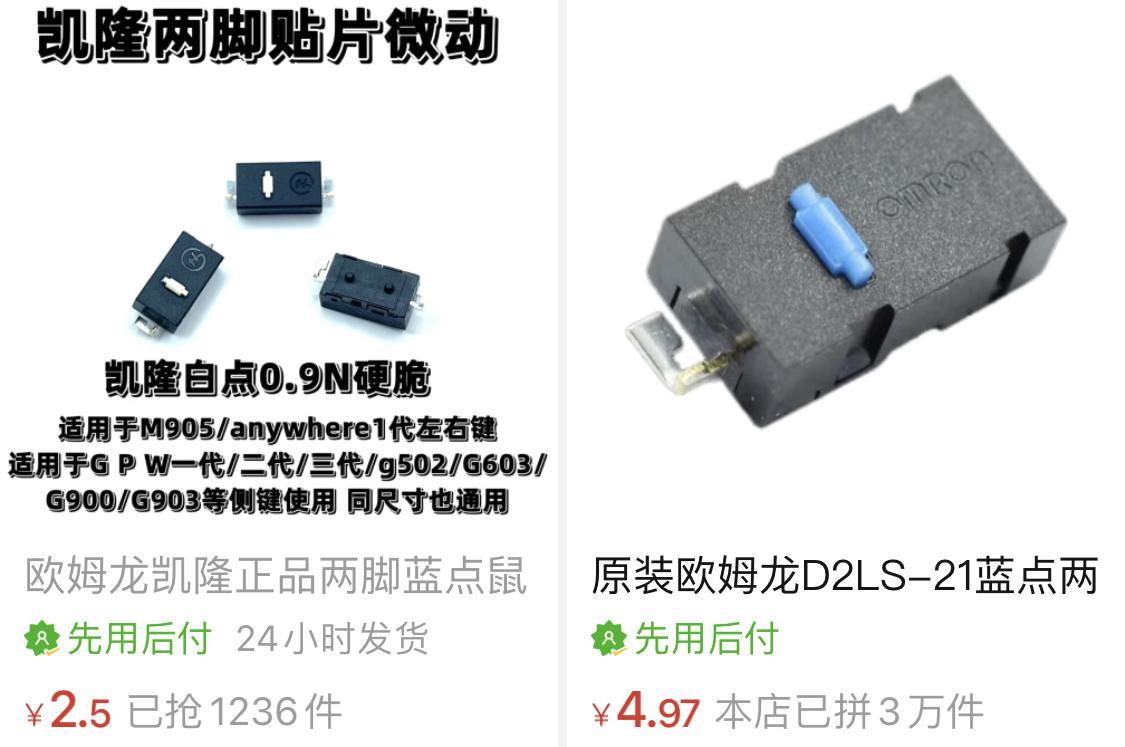 十年前能适配G502的两脚微动其实不太多,主要就凯隆、欧姆龙和凯华三种,价格和三脚微动差不多