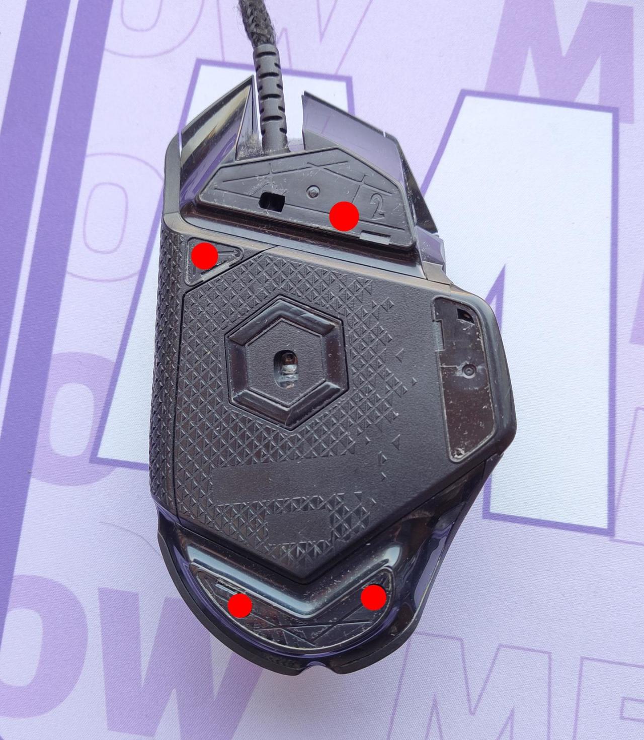 G502有线版更换微动全程只需要拆九颗螺丝,没有大小长短只分,卸下来放在一起即可。因此本期教程只标记螺丝点位