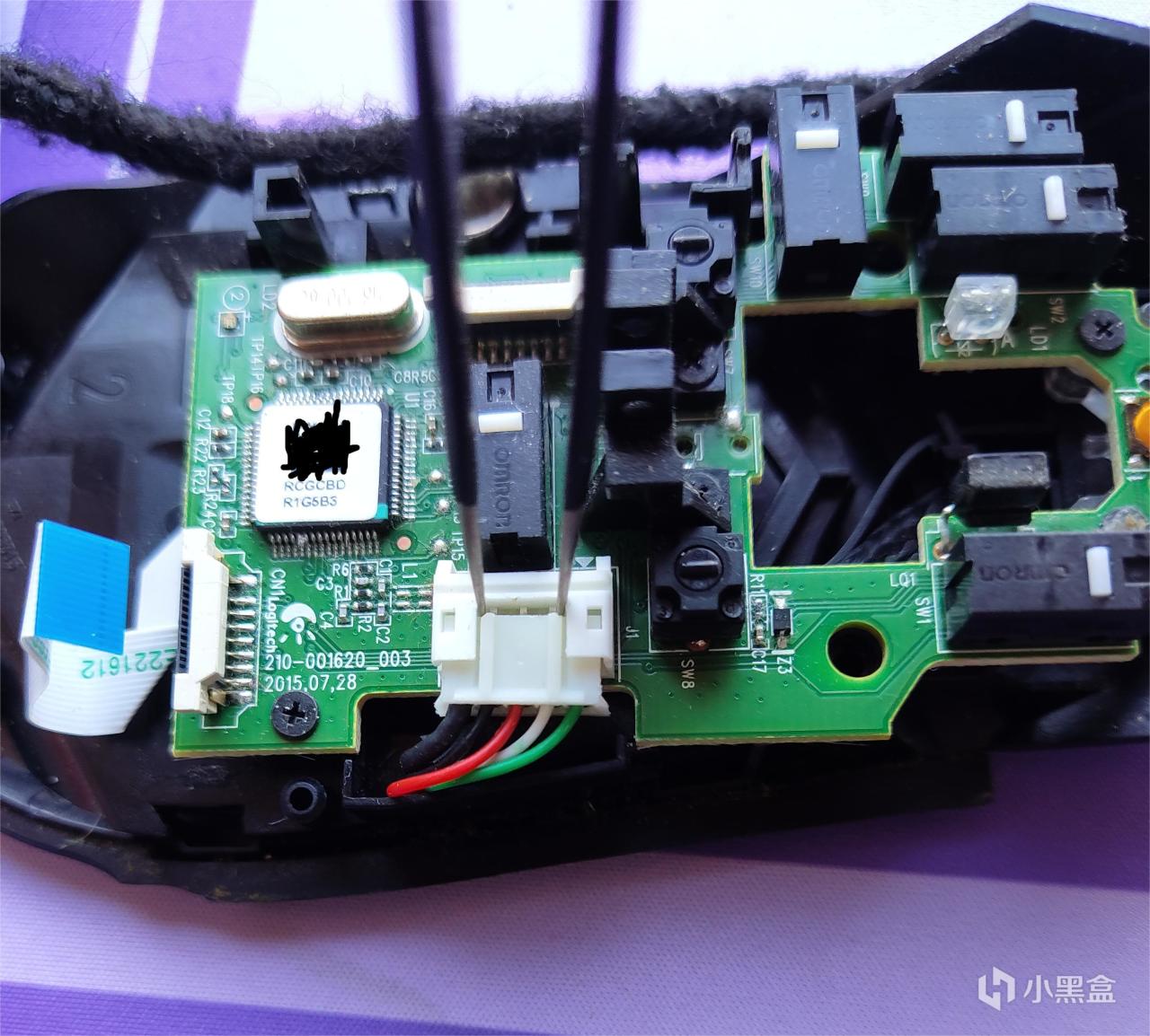 接下来拆下排线,白色的排线需要用镊子撬开白色的挡板(与无线版不同,有线版的是推拉结构,并且比较脆,尽量用镊子轻撬)后即可取下。白红黑的电源绞线直接用镊子插进缝隙里撬一下即可拔出(这个有卡扣,直接拔线是拔不动的)。