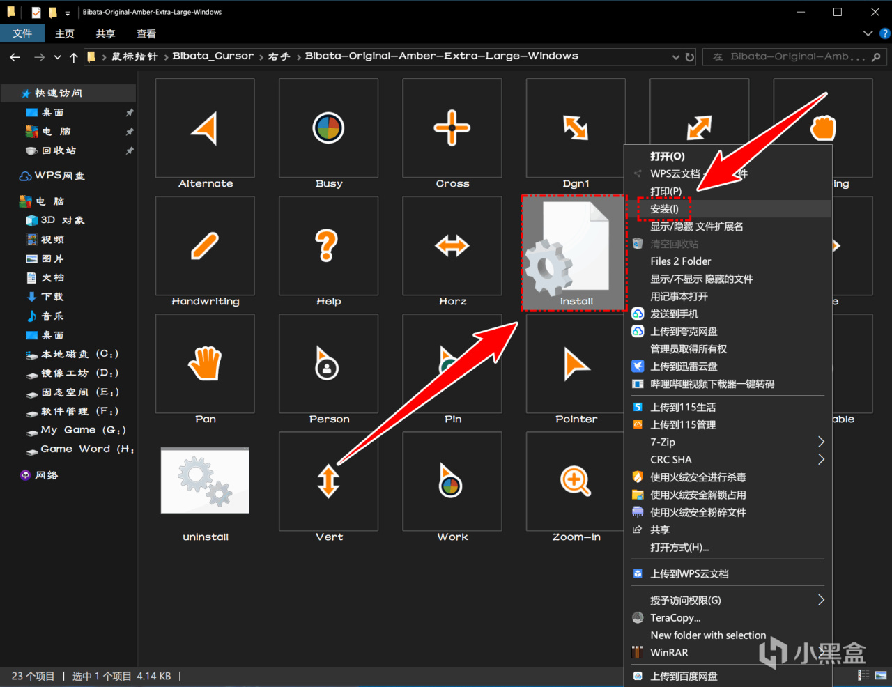 1、解压缩后 – 找到你想要安装的鼠标(文件夹已经标记好左右手类别以及鼠标指针大小分类) – 右键Install文件 – 安装: