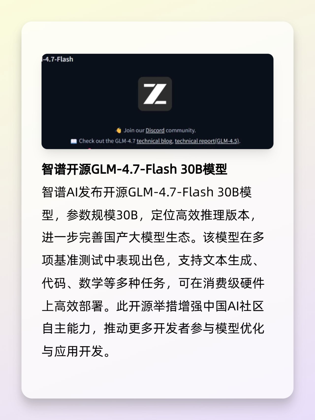 · 智譜開源GLM-4.7-Flash 30B模型:30B參數高效模型發佈,進一步豐富國產開源大模型生態,支持多種任務部署。