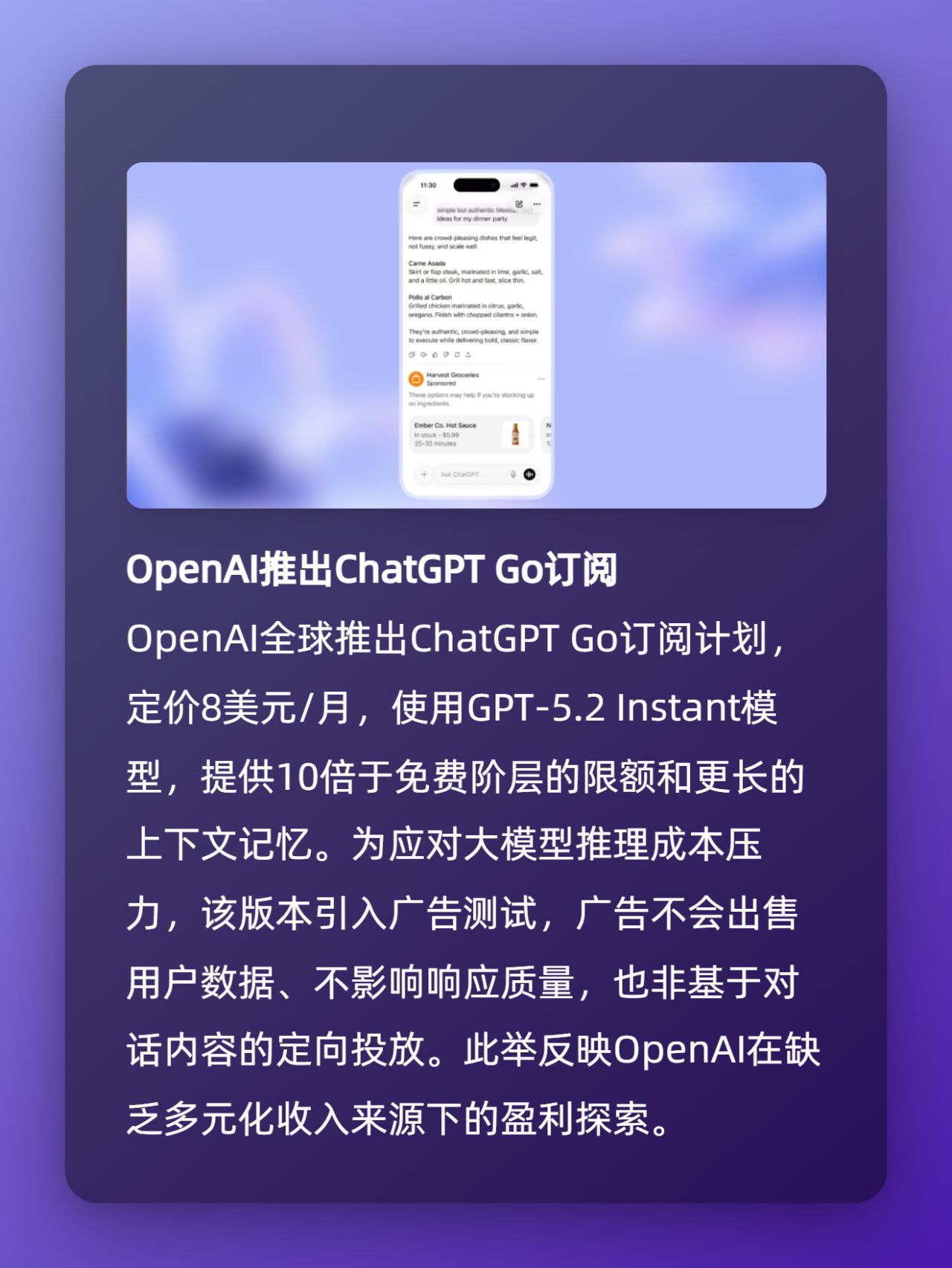 · OpenAI推出ChatGPT Go訂閱:8美元/月低價版,使用GPT-5.2 Instant,提供10倍免費額度並延長上下文,同時引入廣告測試;