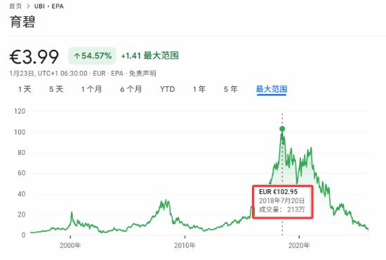 对比2018年的巅峰时期,育碧市值曾高达100亿欧元,单股股价在90-95欧元之间浮动。短短8年间,市值蒸发95%,令人唏嘘。