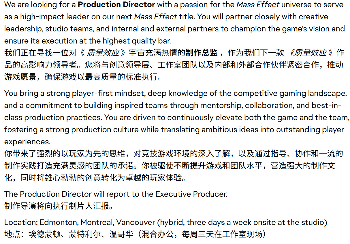 "该职位将直接向我汇报,这将会非常棒。"他在X上表示。此次招聘的职位是制作总监,公司正在寻找对《质量效应》宇宙怀有热忱、能够为续作担任"高影响力领导者"的人选。职位要求包括拥有超过十年参与多款"大型"3A游戏开发的经验,以及"深厚的动作角色扮演游戏与角色扮演游戏开发专业知识"。该职位还要求具备"强烈的玩家至上思维,对游戏竞争格局的深刻认知,以及通过指导、协作和一流制作实践来打造卓越团队的承诺。”
