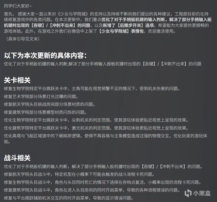 重點優化了對於手柄扳機鍵的輸入判斷,解決了部分手柄輸入扳機鍵時出現的“吞鍵”、“衝刺不出來”的問題,以及新增了“後撤步開關”選項。還有些其他細節方面的優化如