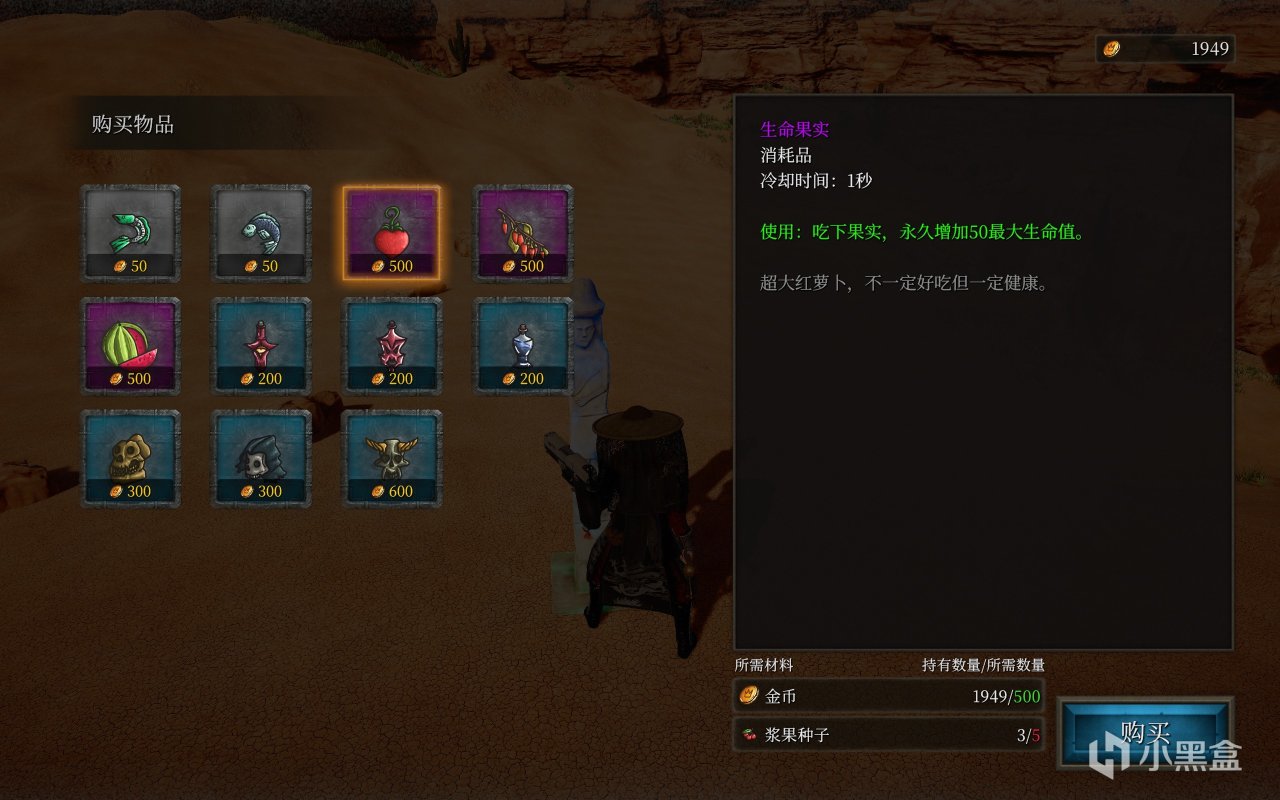 傳送點那邊跟商城可以購買藥水以及永久屬性大果,而且隨着關卡進度推薦,你也能夠獲取更高級的永久大果,不過需要一些boss素材(刷這個記得帶上掉率飾品,減少肝量)。