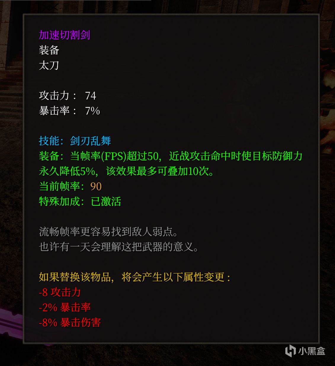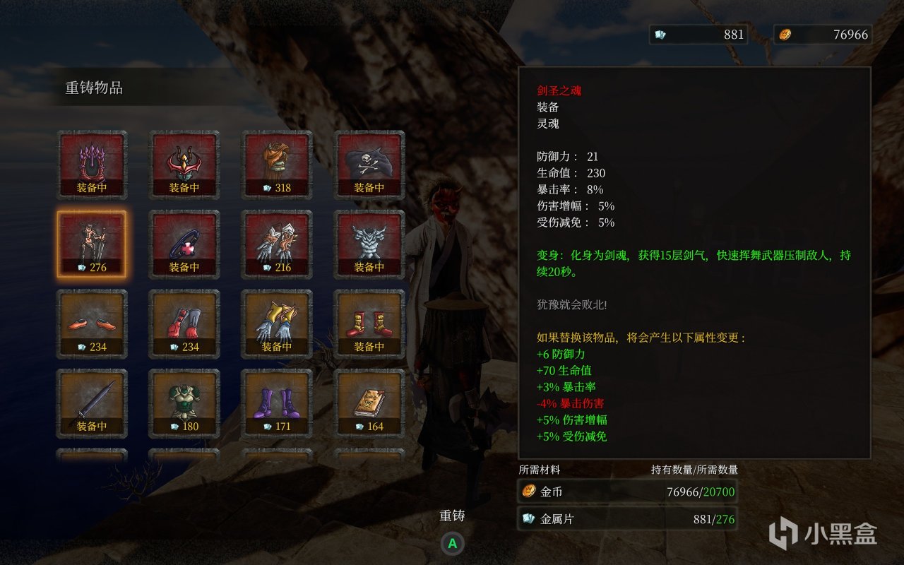 登頂之後,在稀有寶箱中,可以開到劍聖之魂以及儈子手的鋒刃兩件紅裝,前者可以在前面幾章的商人處兌換,算是不錯的裝備,旁邊就是裝備強化商人了,可以分解不要的裝備,用金屬片跟金幣給你的裝備加上一條隨機的詞條(只能說有用,但是不多)。