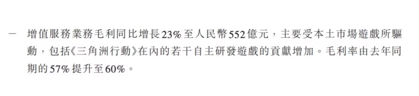 自《三角洲行动》上线后,腾讯在每一份财报中都会提到《三角洲行动》的突出贡献。其中明确指出,《三角洲行动》等自研游戏共享增加,直接提升了腾讯增值服务的毛利表现。