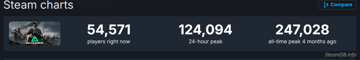 其实《三角洲行动》在2024年9月上线之后的一段时间中,并不被外界看好,但进入2025年后,游戏迅速展现出了非凡的潜力。2025年4月,官方公布游戏DAU达到1200万,根据SteamDB展现的数据,该游戏不仅在国内市场表现强劲,在Steam平台同时在线峰值逼近20万,最高进入Steam同时在线人数榜单第四名。