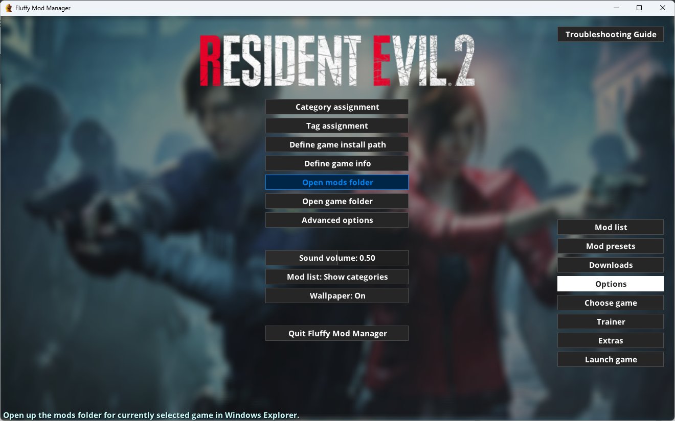 2.右边菜单栏选择options,中间栏选择open mods folder。