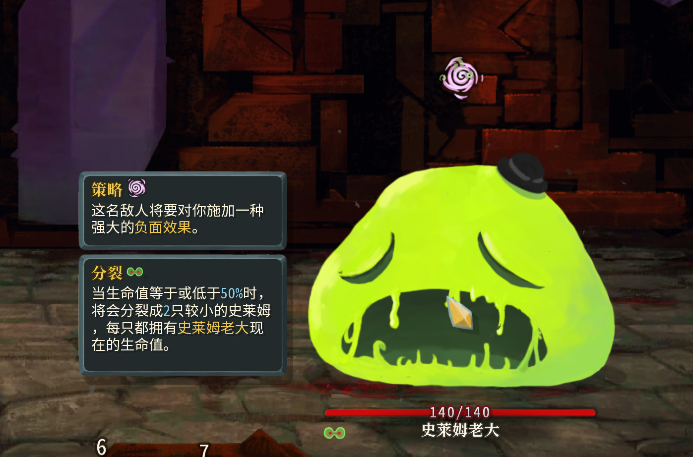 俗稱牢大,這是一層相對容易的BOSS,特殊的機制是生命值低於50%傷害時會分裂,熟悉這個機制之後,牢大的高數值的重擊就打不到我們。聰明的你看到這個分裂應該也發現瞭解題思路,那就是大一輪傷害到半血血線附近,等重擊回合再輸出觸發分裂,血量能壓多低壓多低,分裂的史萊姆血量越少我們越好打。