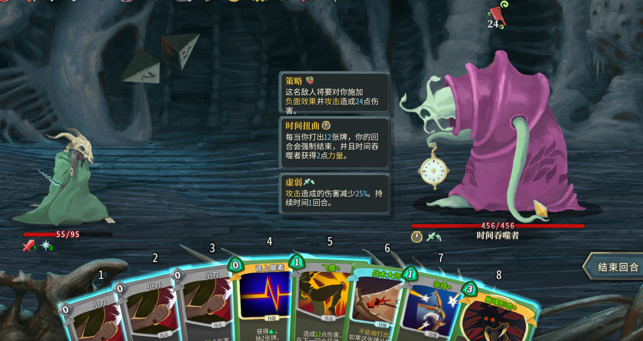 俗稱老頭,這個BOSS是獵人玩家的噩夢,尤其是刀賊。BOSS自帶時間扭曲,每打12張牌就強制結束回合,並且還會加力量,直接改變整個遊戲邏輯的強大規則,有些時候甚至比最終的心臟還難打,是的有些卡組能過心臟,但是你過不了老頭。