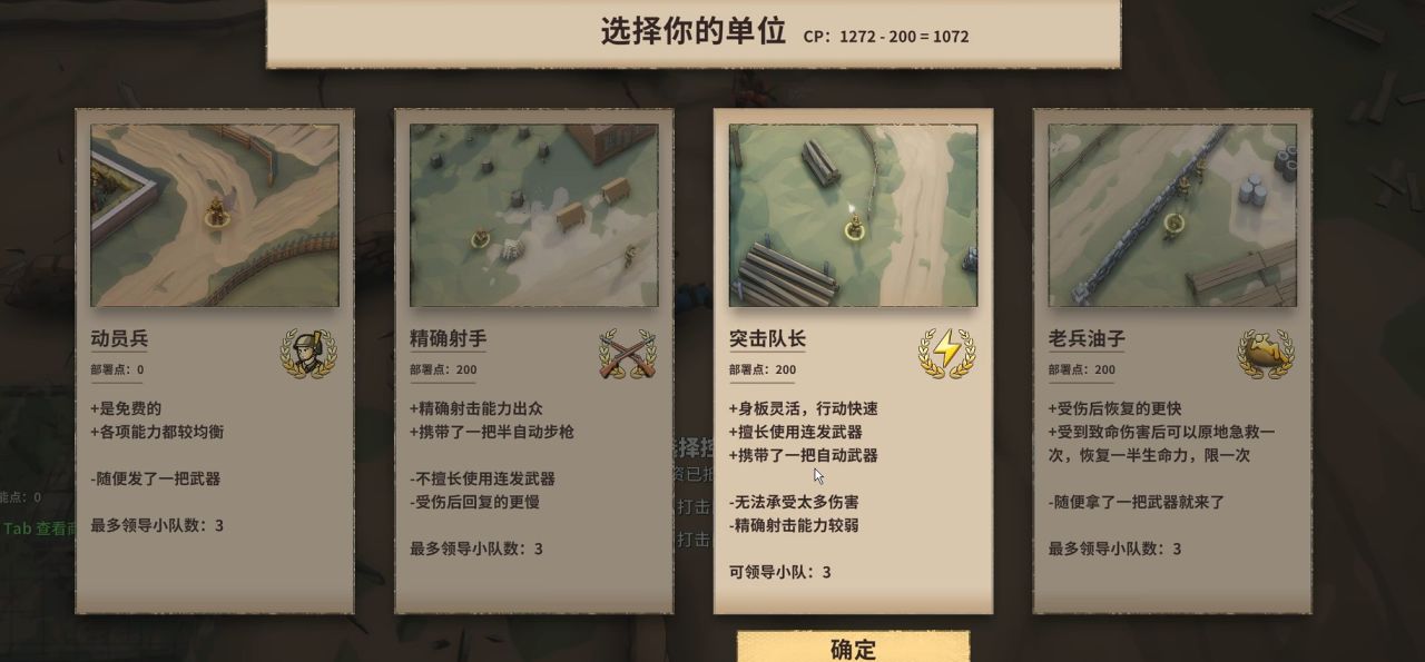 每当你死亡的时候可以通过消耗部署点来更换士兵角色,可选身份类型也非常多,有突击队长、老兵油子等,都有一些自己的能力和特点。部署点需要通过击杀敌军来获得。不同于传统肉鸽死亡即终止,本作一局游戏可以更换多重身份来进行游戏,玩法非常新颖。