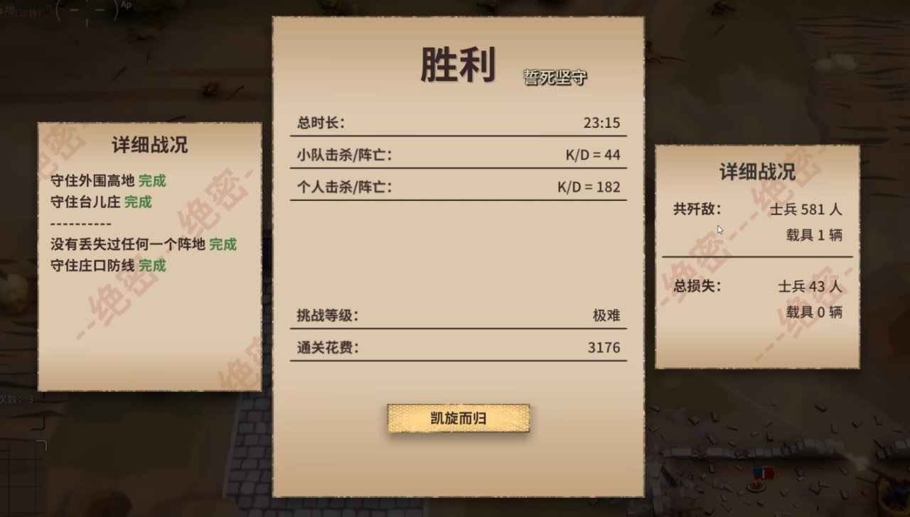 实际操作过程中是有很多战斗技巧的,不是简单的突突突,可以包抄、迂回、诱敌、智取据点,甚至部分战役还可以呼叫炮火支援,每场战役都会有主要目标和次要目标,战斗胜利之后会有一个总结面板,可以清楚看到双方的战损和任务完成情况。