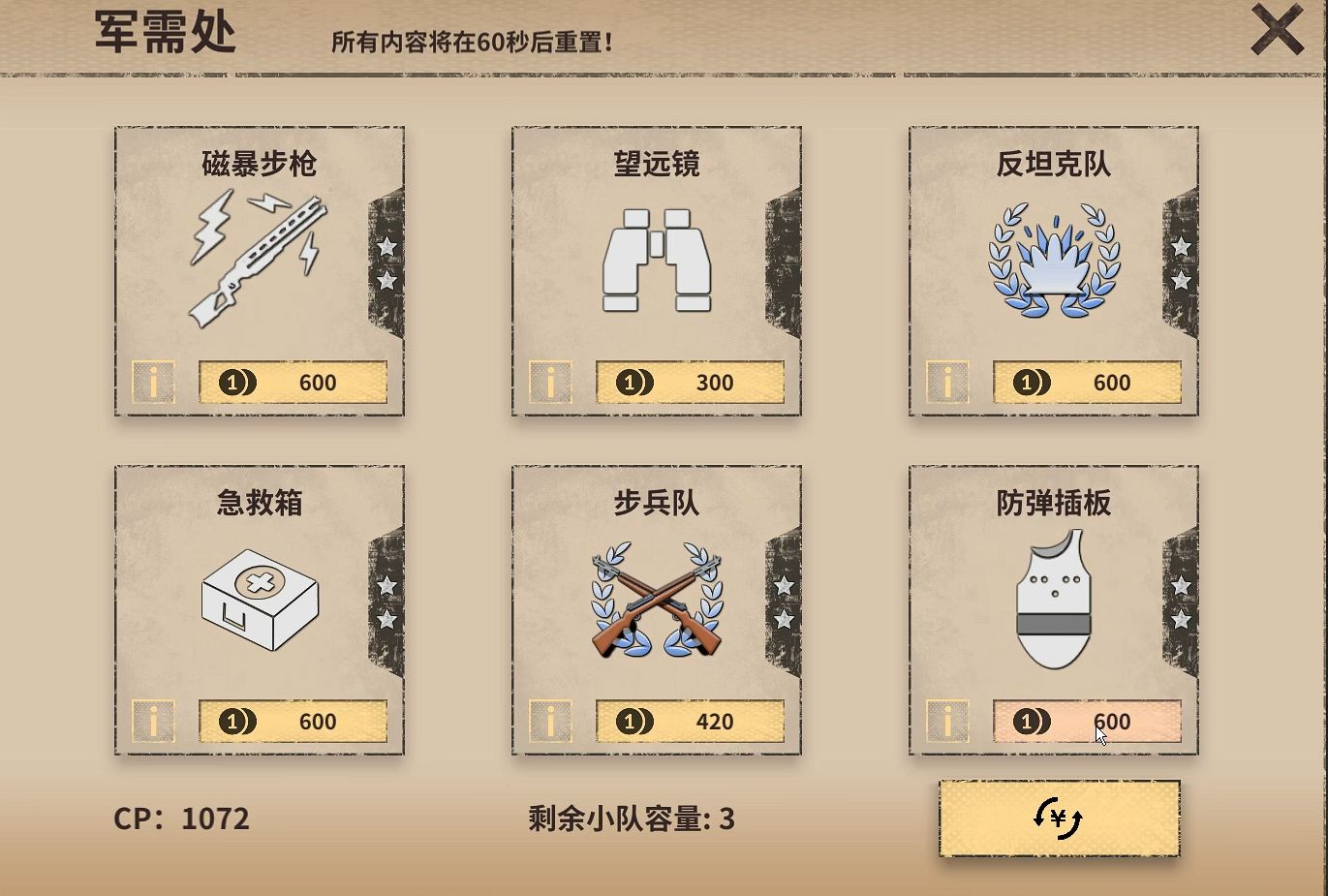 部署点除了更换更强的职业,还可以再军需处购买各种武器道具、作战小队等(每60秒刷新一次)游戏内是有友军伤害的,所以要注意自己小队的位置,防止手滑误伤。个人还是喜欢单兵作战,不然容易手忙脚乱。