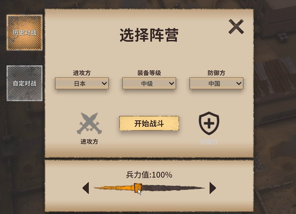 大战场分为历史对战和自定义对战,自定义的话可以选择进攻方、装备等级、防守方,但是通关数据不会被记录。而历史对战只能调整兵力值,其他是不能变的,制作方还是非常细节的。不仅重视历史,还方便玩家可以根据自己时间来调整把握。
