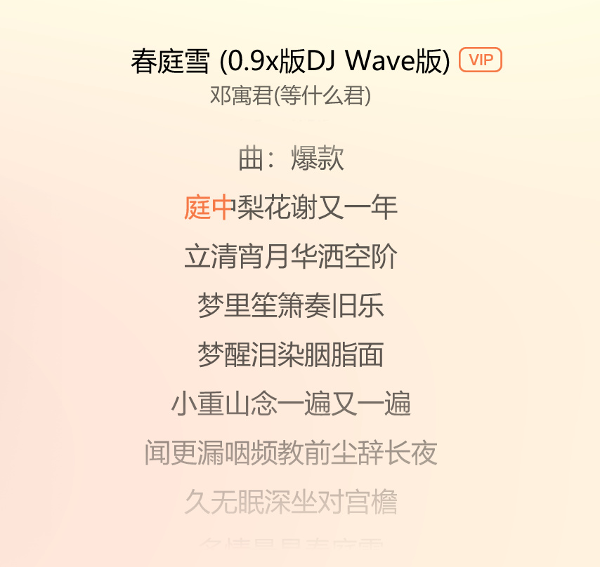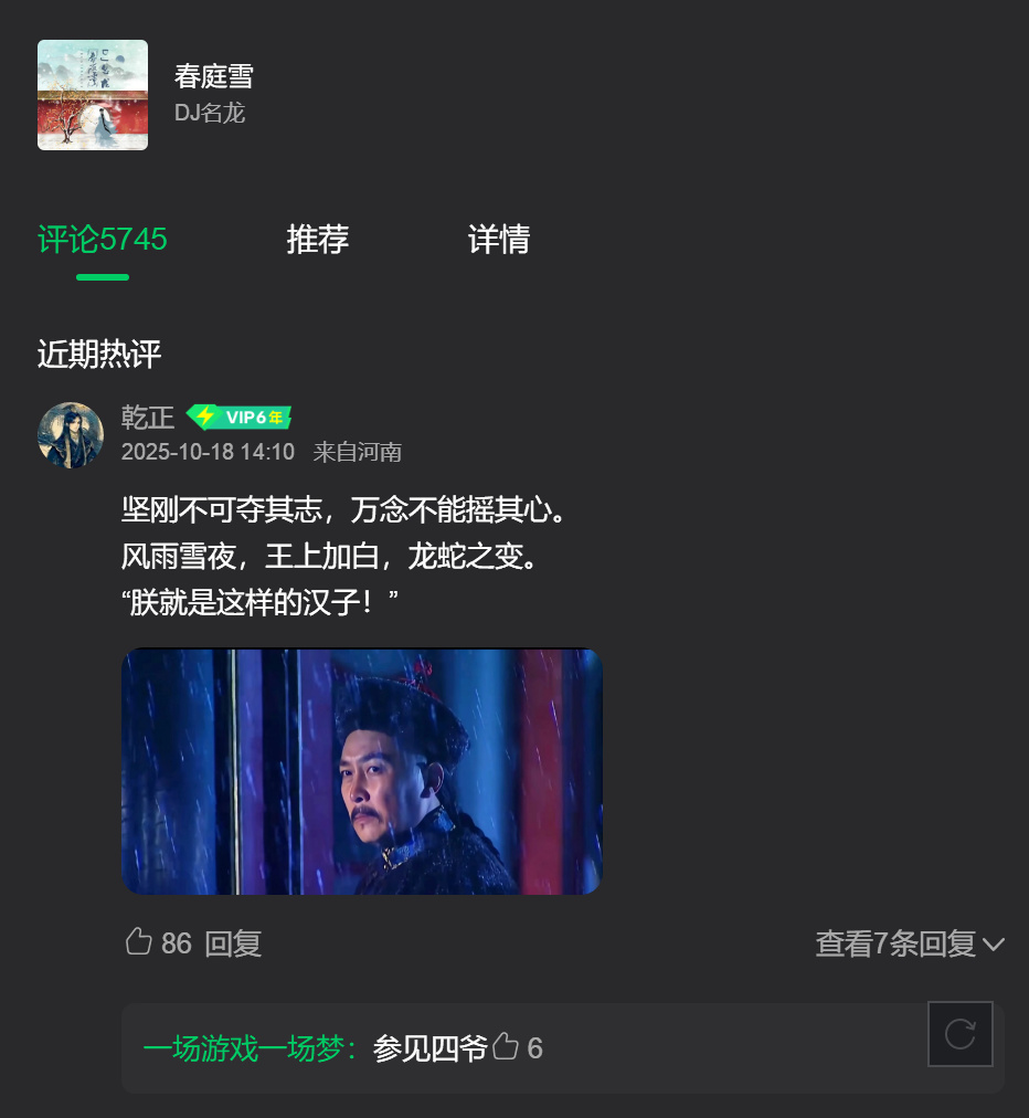有一首《春庭雪》的慢放DJ版,经常用来配解说到第20集、雍正风雪夜即位那段,作为“九子夺嫡MVP结算画面”的BGM(被戏称为“雍正の小曲”)。