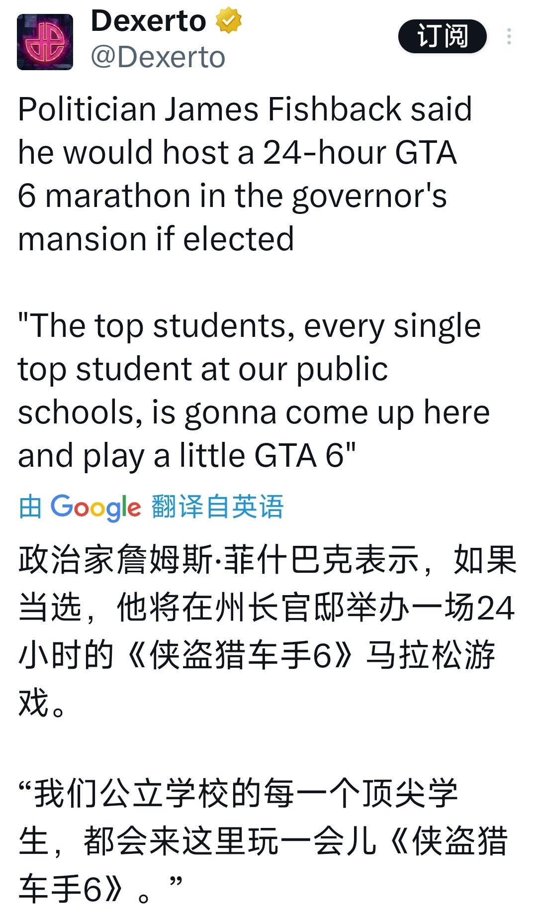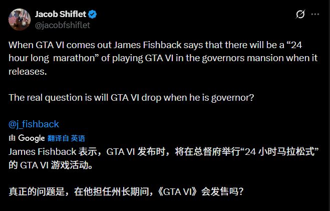 这场演讲发生在佛罗里达的户外集会现场,菲什巴克身穿深色西装,身后是热情的支持者。视频显示,他一边演讲一边手势生动,现场观众多次鼓掌,氛围热烈,他称:“当《GTA 6》终于来临时,我们将在州长官邸举办一场24小时的《GTA 6》马拉松!我们公立学校的每一位顶尖学生,都会来这里玩一玩《GTA 6》。”“听着,你们需要一位能在《GTA》里开几次劫车的州长!”