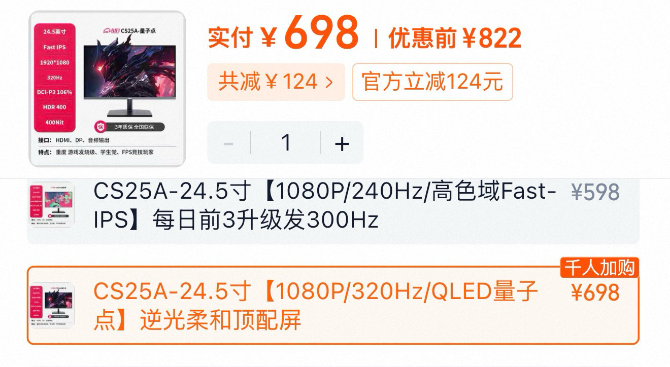 上面这个图就是CS25A量子点,24寸320hz,而定位就是FPS游戏发烧友;刚刚看了下某宝,居然已经七百块了? 年促叠卷可能更低,性价比这块真狠狠拿捏住了!
