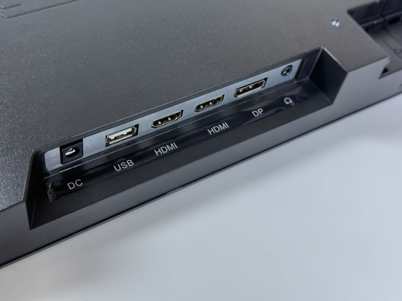 背部接口类型还是蛮丰富的,2个HDMI、1个DP 、电源孔、USB、耳机孔