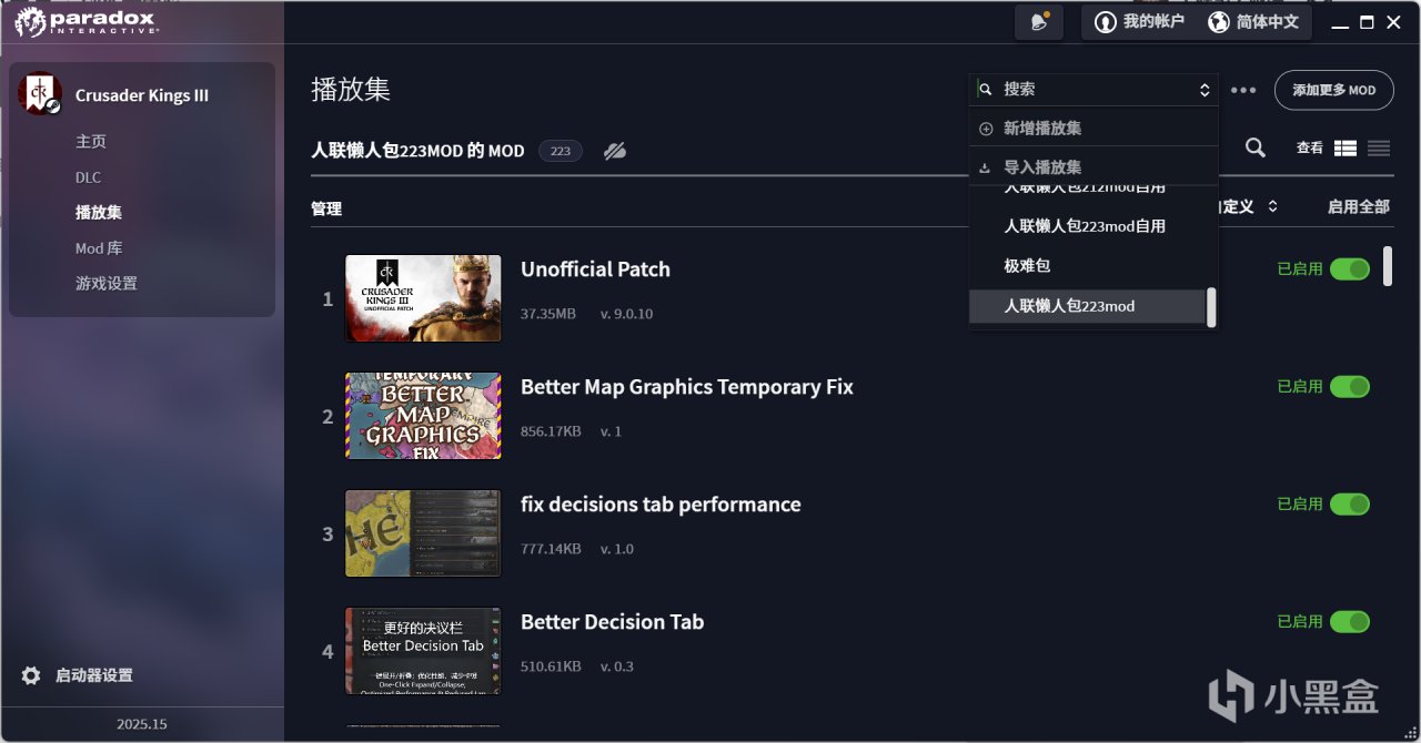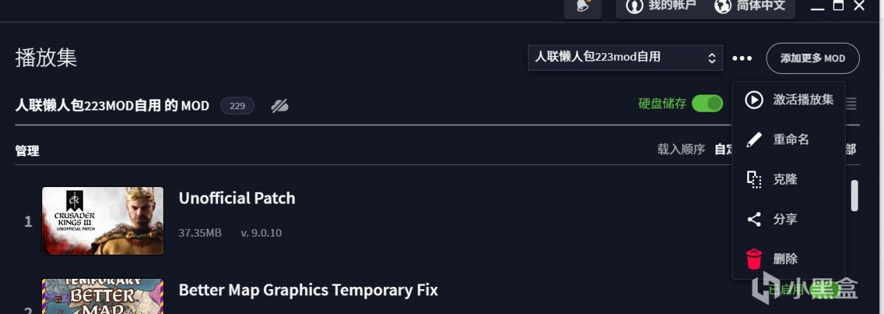 播放集可以自行分享,克隆,重命名,选择更多mod加入合集。