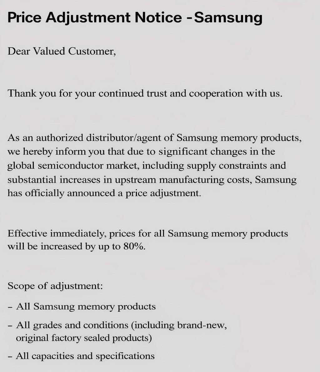 这份通知据称源自韩国器兴三星电子设备解决方案园区的一名员工,因此被视作官方文件处理。三星尚未确认或否认网络上这份广泛传播的报告,据报道此调整立即生效,因此其他授权及官方公司分销商和经销商也将在存储产品上实行同样的涨价措施。