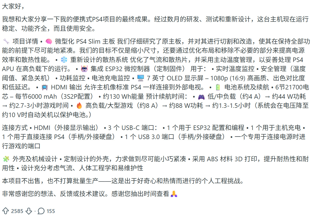 索尼现在出的PS Portal必须连着网络,还得有台PS5才能用。很多玩家其实想要一台真正能独立运行PS4游戏的掌机,就像以前的PSVita那样。这个改装作品正好说明,技术上是可以实现的,而且效果还不错。不过很可惜,这只是个人作品。作者暂时没打算卖,也没公开制作图纸。但这次改装至少证明了一件事:玩家对便携式主机的需求是真实存在的。说不定哪天,索尼会公布一台真正的PS掌机。