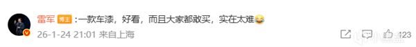 雷军自己也在评论区坦言:“一款车漆,好看,而且大家都敢买,实在太难”。