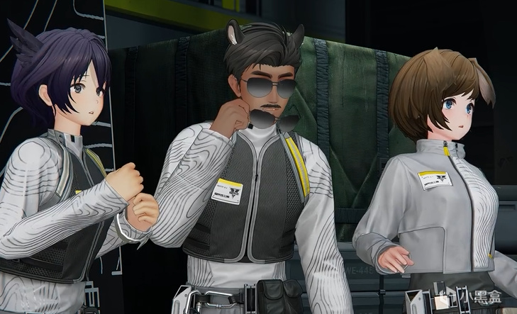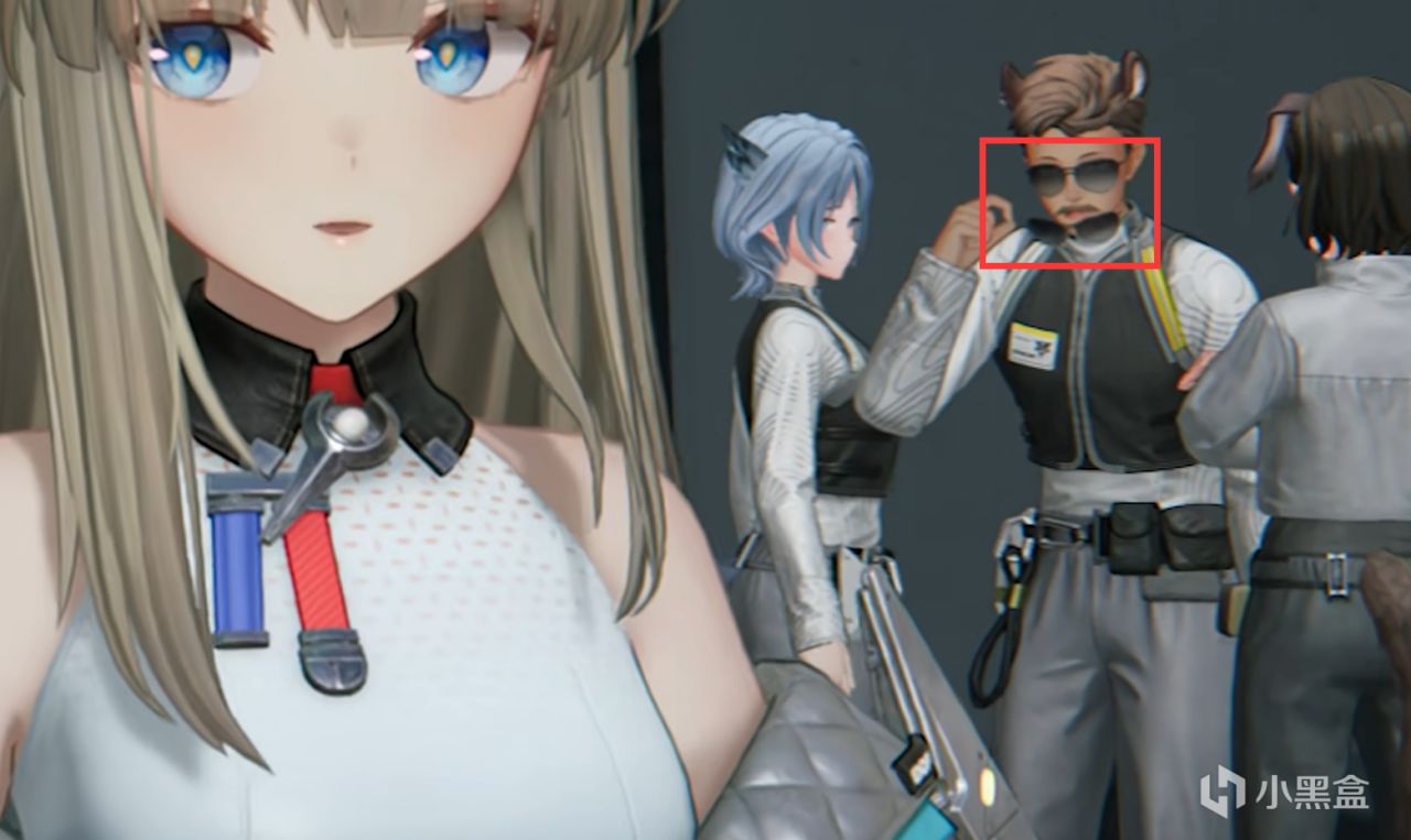 怎么个明显BUG呢?就这个开局来到帝江号的过场剧情中,管理员跟着佩丽卡来巡视,佩丽卡正在跟爷唠嗑呢,旁边的工作人员,对,就这仨美女和靓仔,好奇的看着我们,不是哥们,房间里这么黑戴墨镜看得清吗?确实看不清,所以靓仔摘墨镜下来惊奇的看我们,这下换我们惊奇的看着他了——摘一副墨镜还有一副墨镜,你墨镜长脸上了?