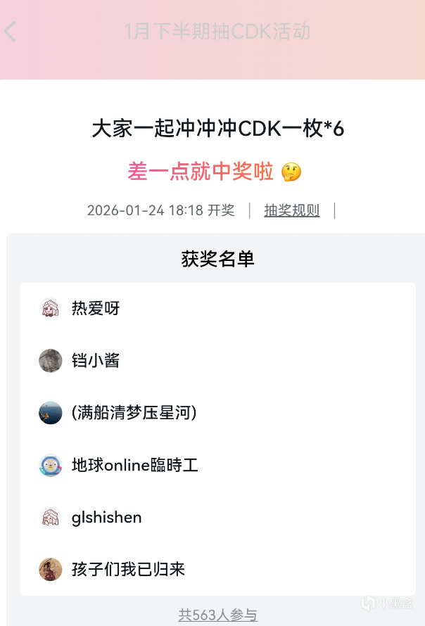 昨天下午18点18分咱们1月下半月的抽奖活动顺利结束了,共有563名盒友参与,共抽出6名幸运盒友,中奖名单如下!感谢大家的支持,真的没想到会有这么多盒友参与进来,所以下期奖品数量增加到10个~大家可以关注一波。