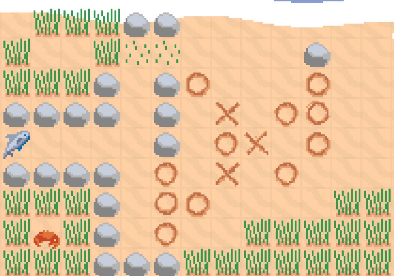 具体而言,在你每次下棋之后,对手都会以某种确定性、可预测的方式进行应对,玩家的目标是在场内制造出属于自己的“三连”,同时毁掉所有对手的“三连”。同时,你还可以操纵海浪和其它小动物来影响场内的状态,别担心这是不是“作弊”,因为你的对手也并不是什么“善茬”,只能说你们是“旗鼓相当的对手”。总之虽然核心是“井字棋”,但和常规意义上的“下棋”有非常大的区别,本质还是解谜。