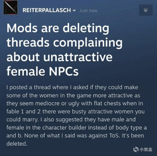 事件导火索源于一名玩家在Steam讨论区发帖称:“女性角色设计普通甚至丑陋,建议优化”,该帖随后被版主以“违反社区准则”为由删除。