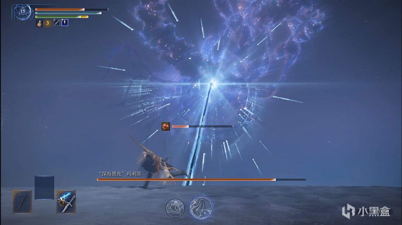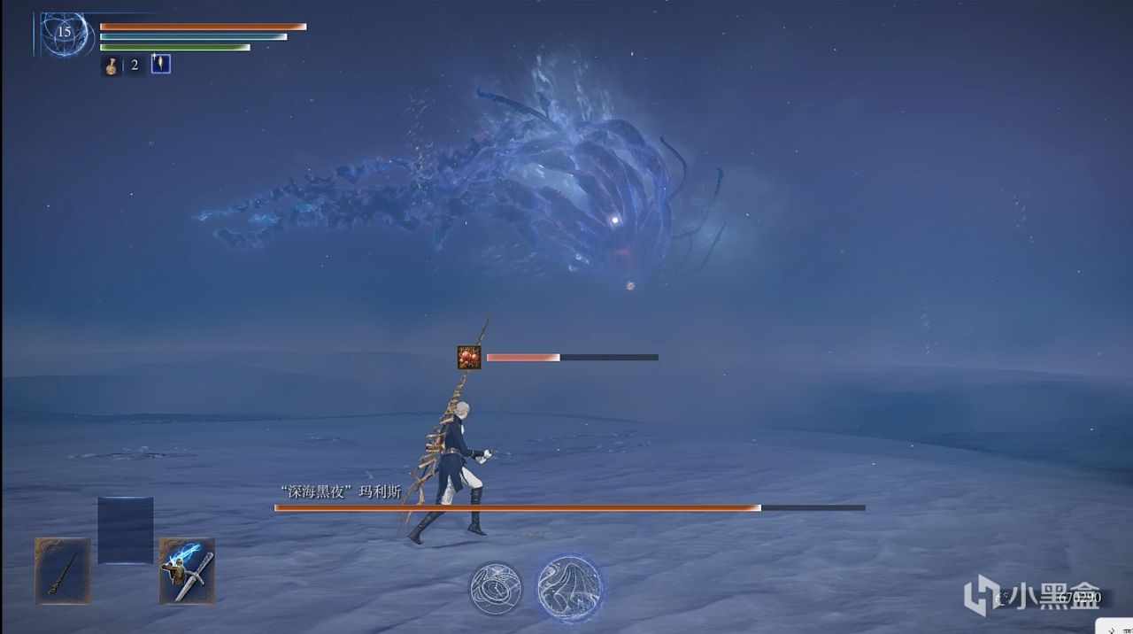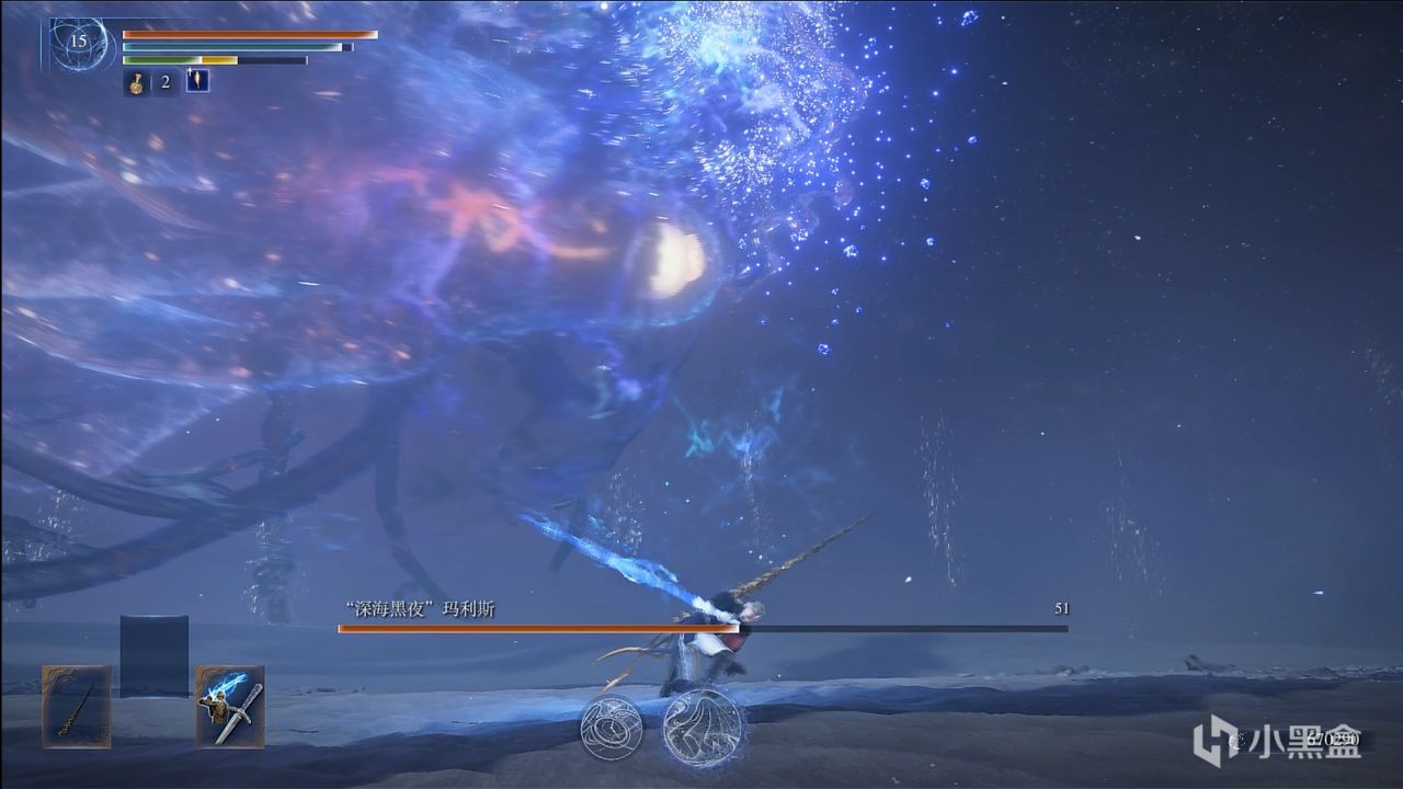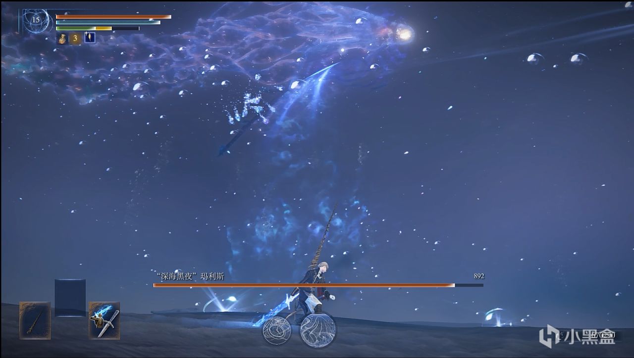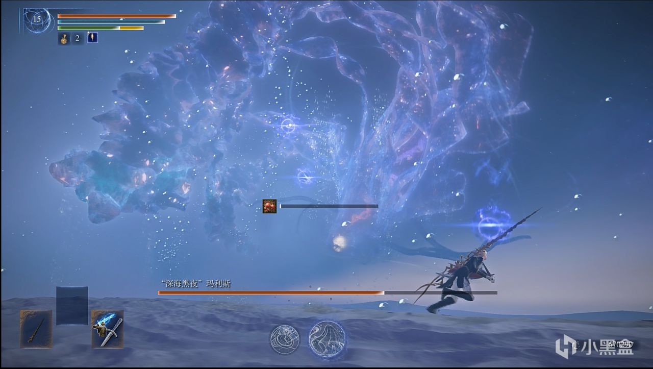 撒小水泡,这招似乎令人头疼,因为水泡密集,还有较高催眠值积累,数量多,难以看滚。而实际上,战技可以轻松化解水泡,在战技光波的路径上,水泡都会消失,战技的判定范围较大,不用担心残留。而你要做的是控精,一直放轻战技,你的精力条很快就会顶不住,然后就被持续的攻击淹没。解决办法也很简单,水泡是一批一批游来的,看一批水泡接近时,就发动一下轻战技,然后立马原地站立回精,看下一批快到时再发动轻战技,以此循环往复