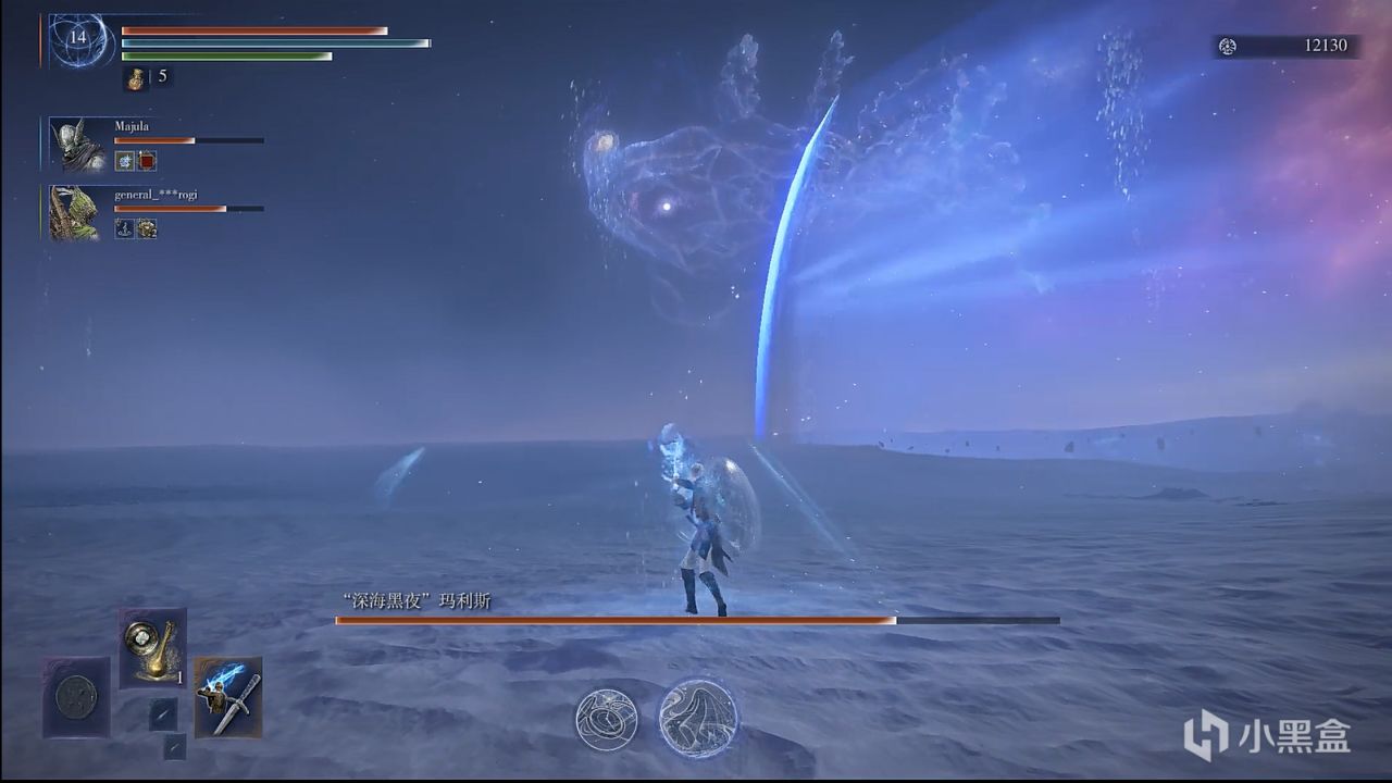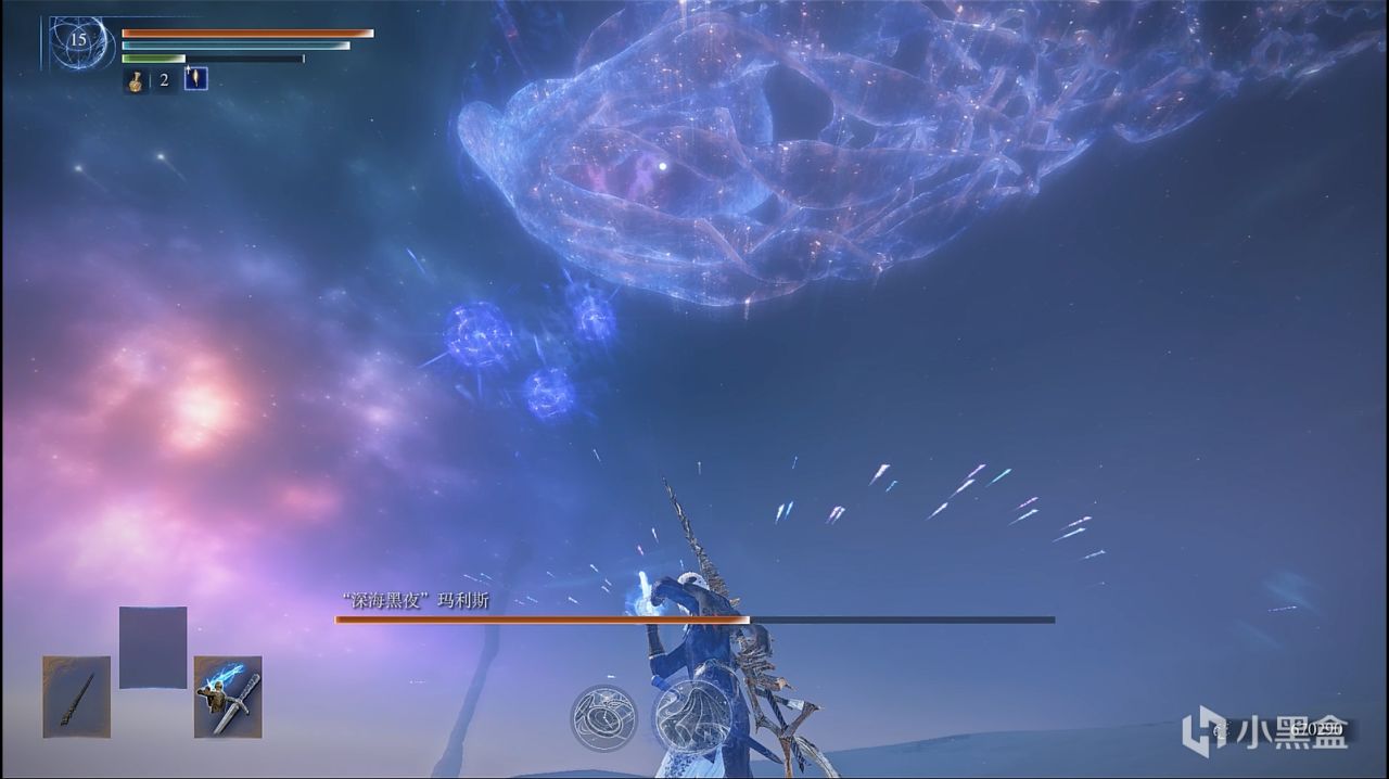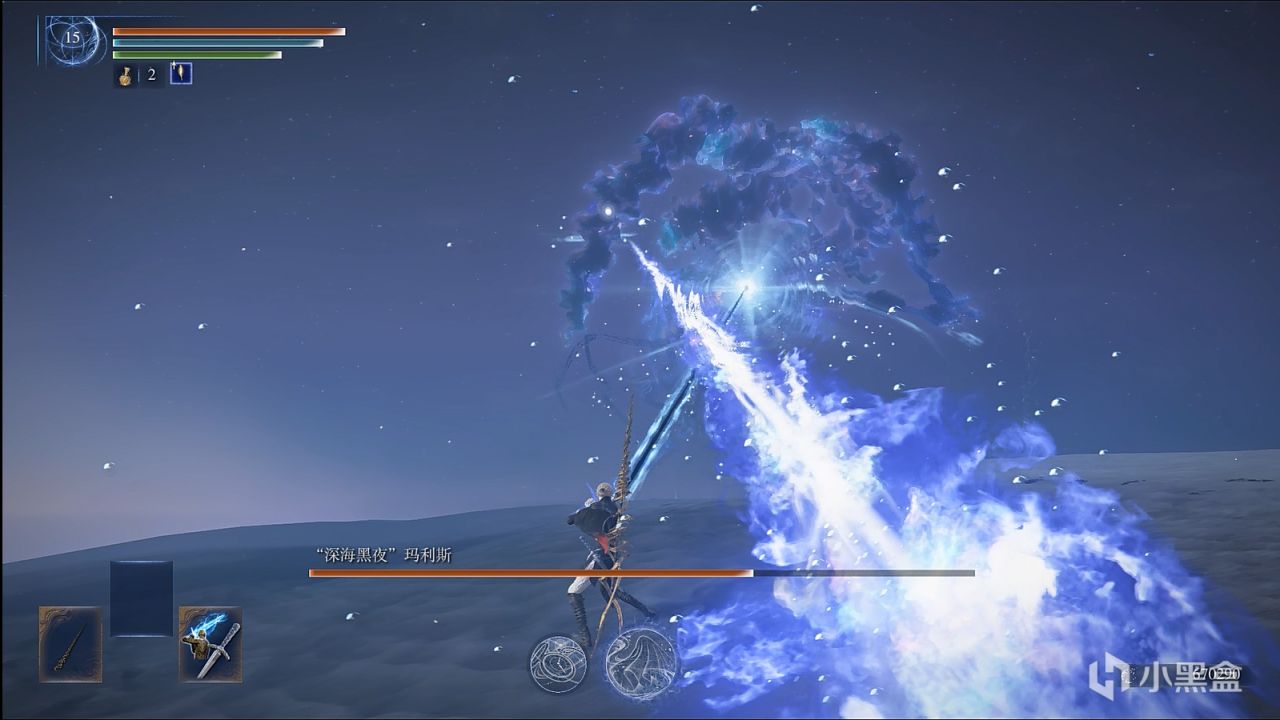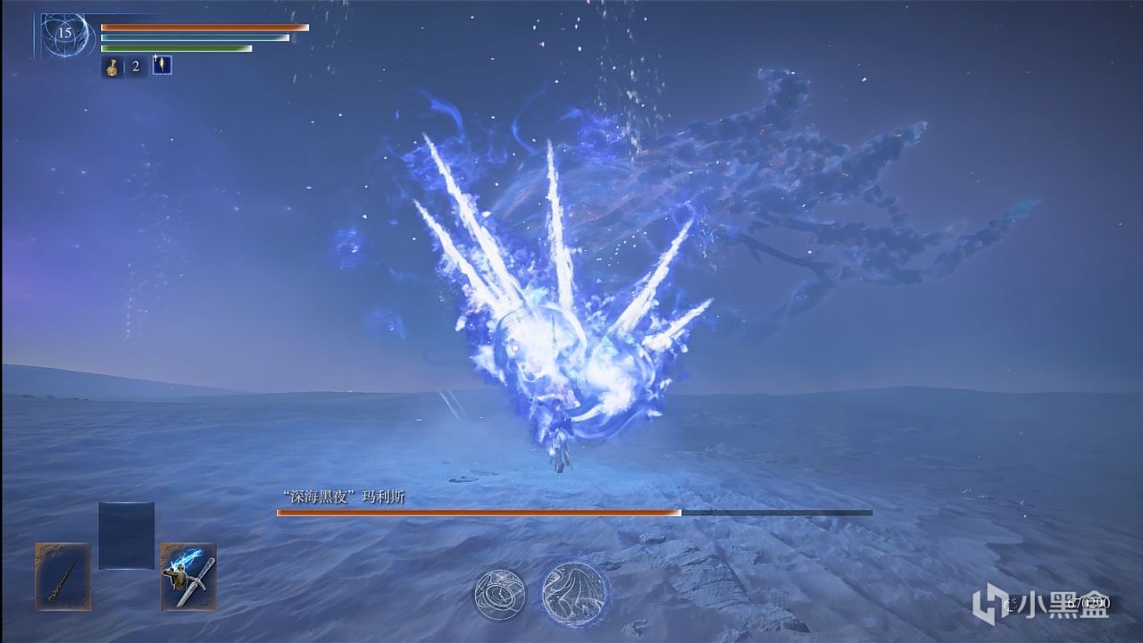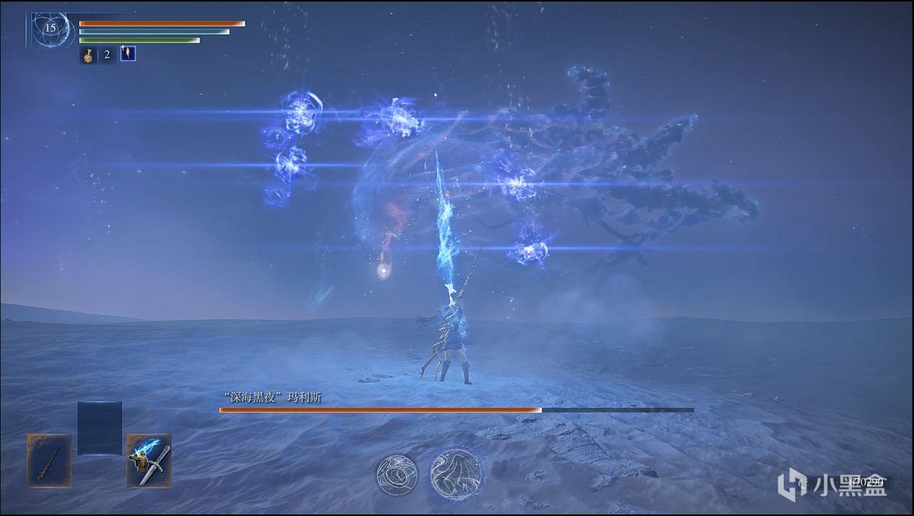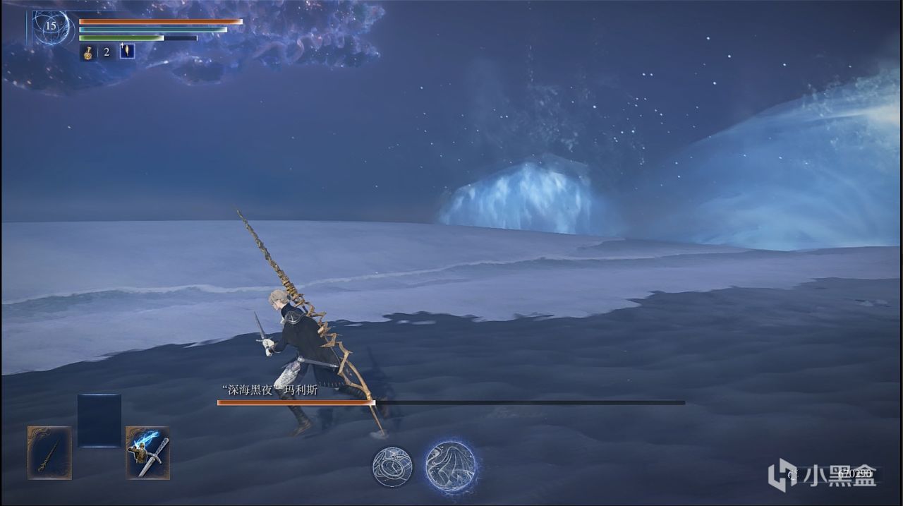 撒小水泡,这招似乎令人头疼,因为水泡密集,还有较高催眠值积累,数量多,难以看滚。而实际上,战技可以轻松化解水泡,在战技光波的路径上,水泡都会消失,战技的判定范围较大,不用担心残留。而你要做的是控精,一直放轻战技,你的精力条很快就会顶不住,然后就被持续的攻击淹没。解决办法也很简单,水泡是一批一批游来的,看一批水泡接近时,就发动一下轻战技,然后立马原地站立回精,看下一批快到时再发动轻战技,以此循环往复