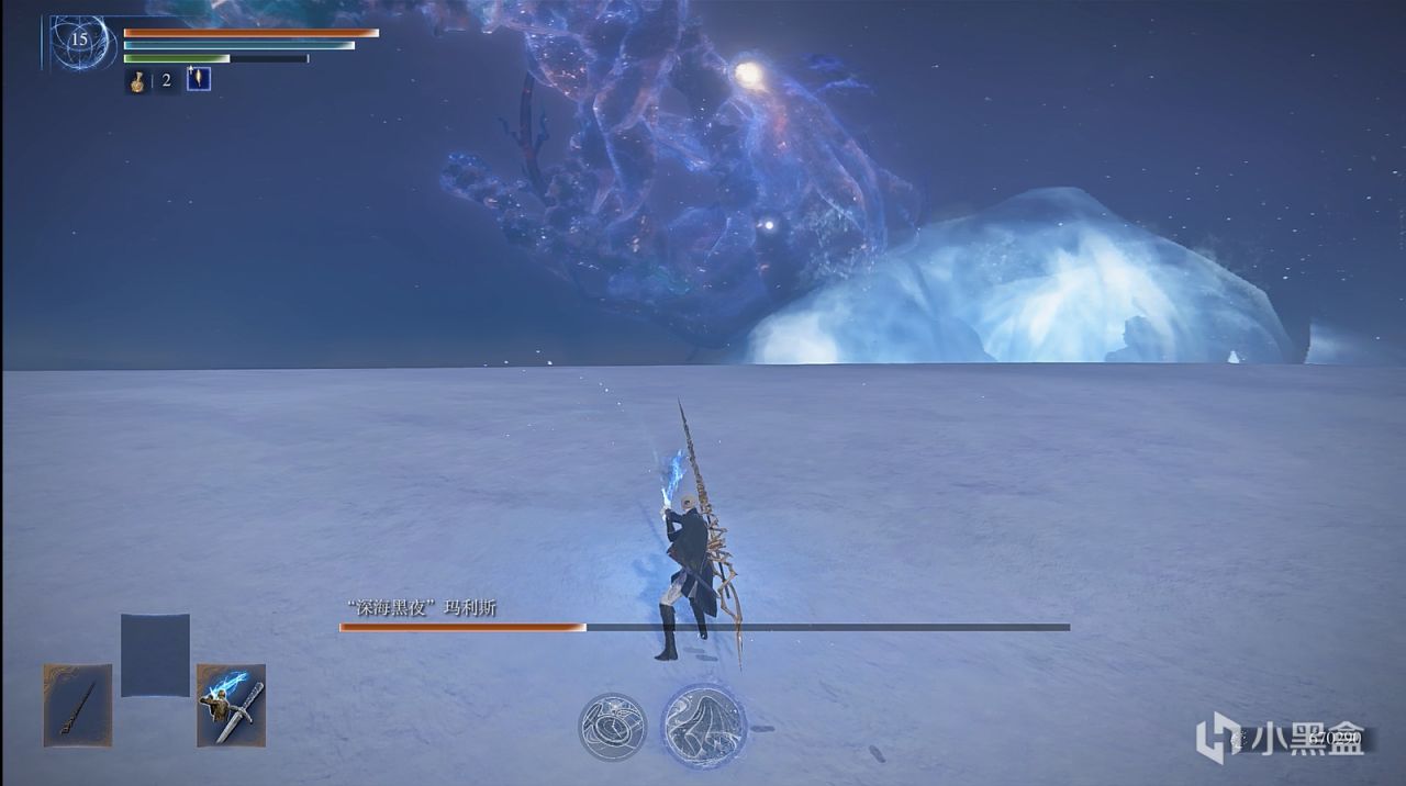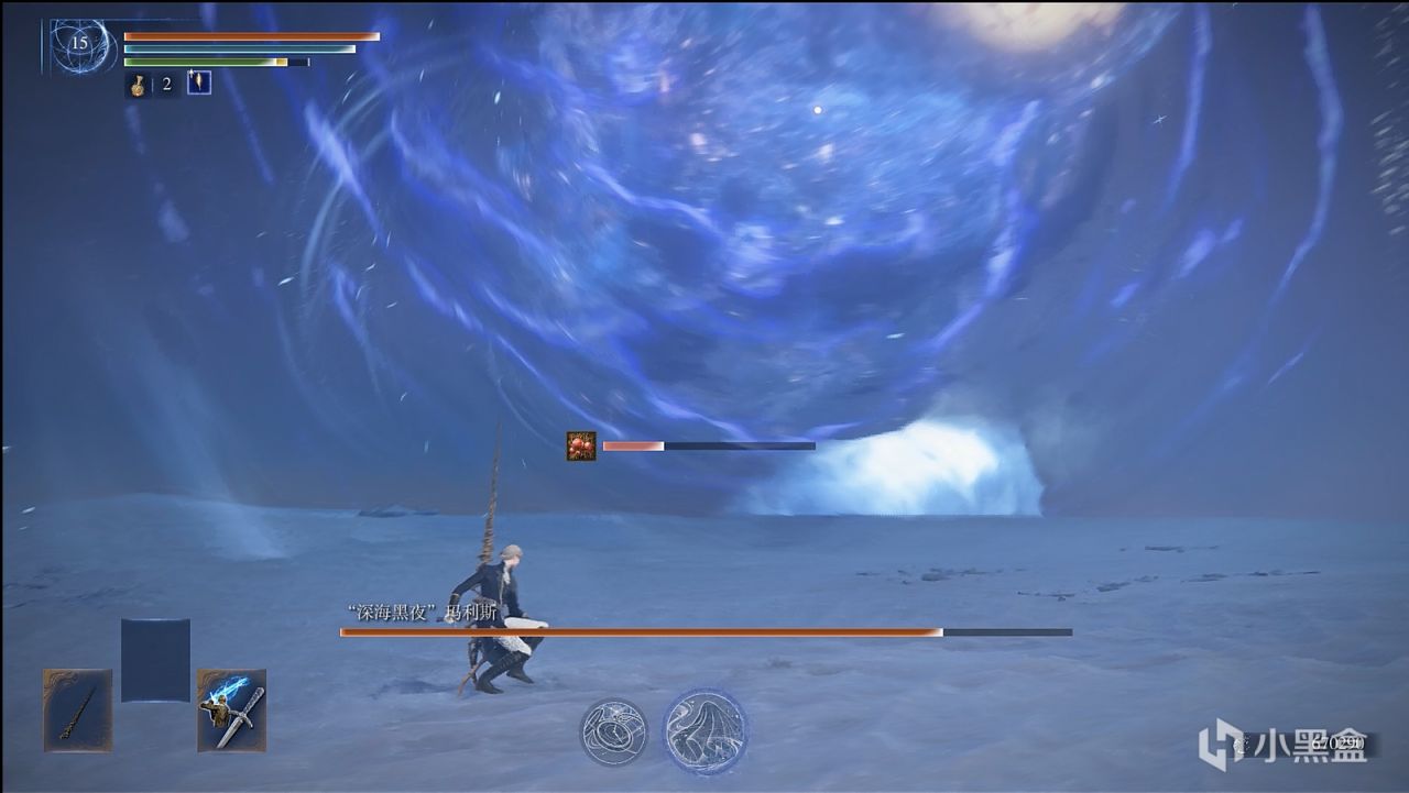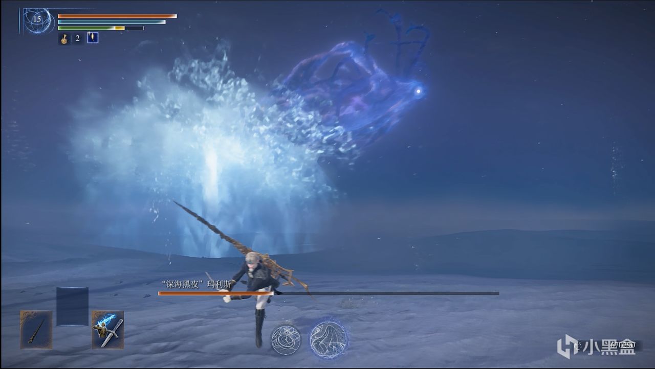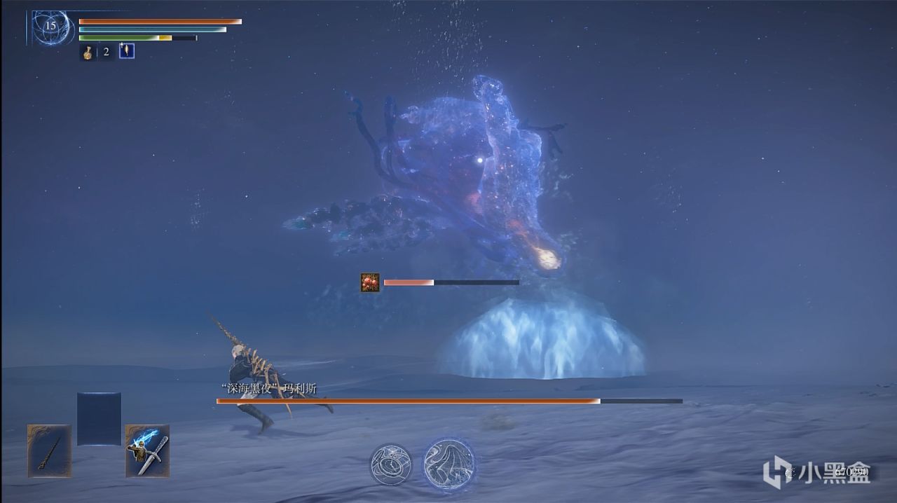 海啸(只有一阵),这招的前摇是boss会在头部汇集水流,一定要看清,因为这招如果淹没了你,那你是必死一次了。只要看到它出这招,接下来的躲法就简单了,只要向海啸席卷来的垂直方向疾跑,直到海啸打不到你即可
