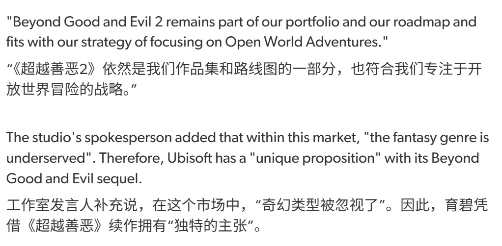 育碧发言人向Eurogamer透露:"《超越善恶2》仍然是我们产品组合与路线图的重要组成部分,其符合我们聚焦开放世界冒险游戏的战略方向。" 该发言人进一步强调,这款作品在奇幻游戏领域具有"独特定位",这正是公司持续投入的主要原因。