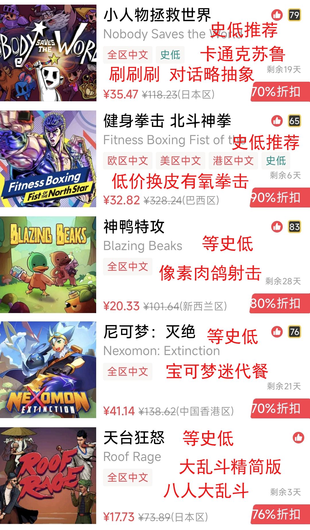 第三组游戏 休闲推荐 《北斗神拳》换皮版有氧拳击 只需三十~ 《尼克梦 灭绝》等等低价 宝可梦代餐