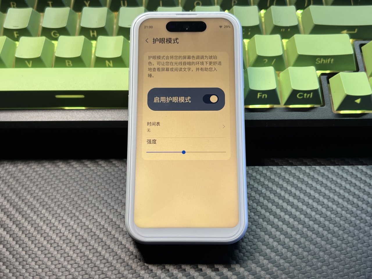 配置这块,首先这块4寸540P的屏最高亮度有500nit,刷新率60Hz,是块LCD屏,显示效果受小尺寸带来的优势清晰锐利,无频闪,有一定的护眼效果,同时显示设置里也有护眼模式,默认开启后屏幕黄的有点过分,不过点进去能调节强度,总体来说这块屏作为一款备用机也够用了。